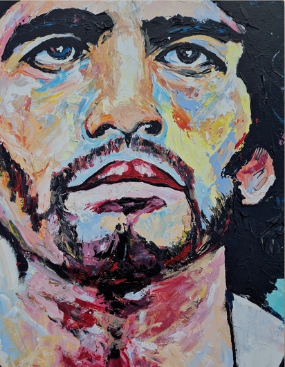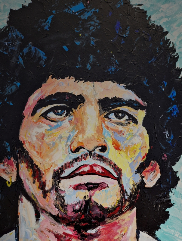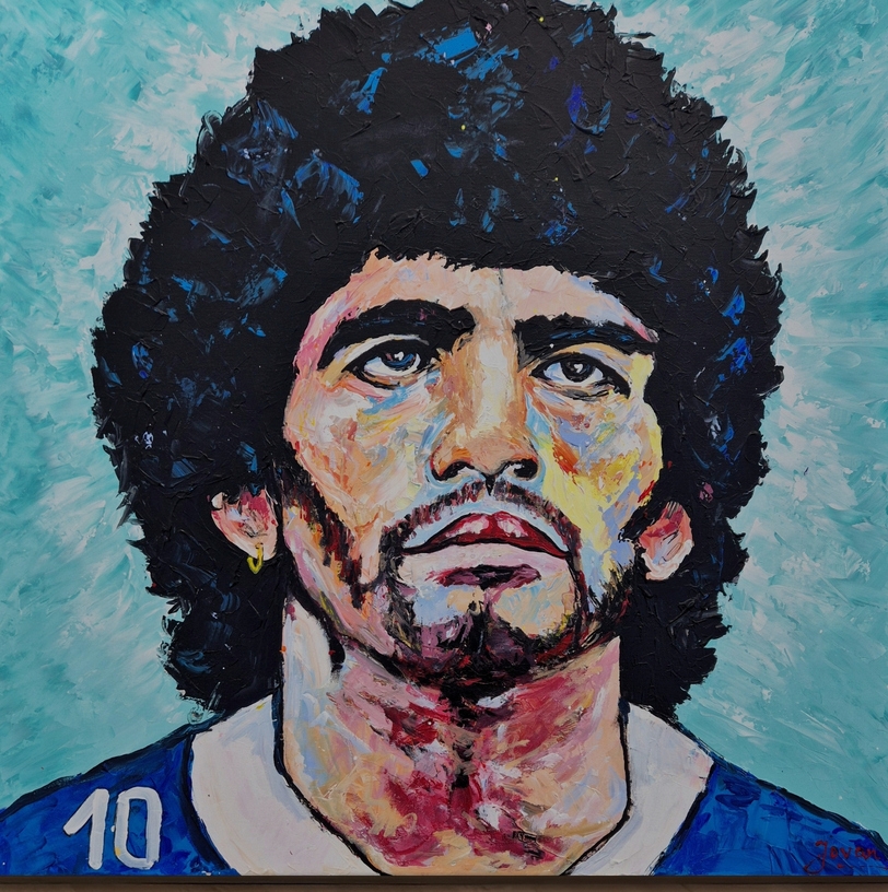 Origineel, abstract portretschilderij (80 x 80 x 2 cm) "Diego Armando Maradona" van de Nederlandse professionele hedendaagse kunstenaar Jovan (1962). Werk wordt geschilderd met paletmes en penseel, en verf wordt op een abstract expressieve manier met grote dynamiek op het doek aangebracht. Werk past goed in een modern interieur of kantoorruimte Gelakt, met echtheidscertificaat. "De chaos van ideeën die in mijn hoofd zijn ontstaan, de energie die van binnenuit is beroofd, wil dat eruit, als een vulkaan, en zo wordt een explosie een symfonie van kleuren op het doek. Vanuit het onbewuste, vaak chaotische en explosieve toepassing van verf op het doek, ontstaat: in het begin ongeplande figuren, objecten, portretten of een abstracte compositie. Zoals bij de ongeplande conceptie van een kind: geboorte, opgroeien, tot persoonlijkheidsvorming en zijn leven. Geboren, opgroeien, en we worden allemaal ingelijst in het lichaam, ons frame, maar ieder is op zijn eigen manier uniek. '