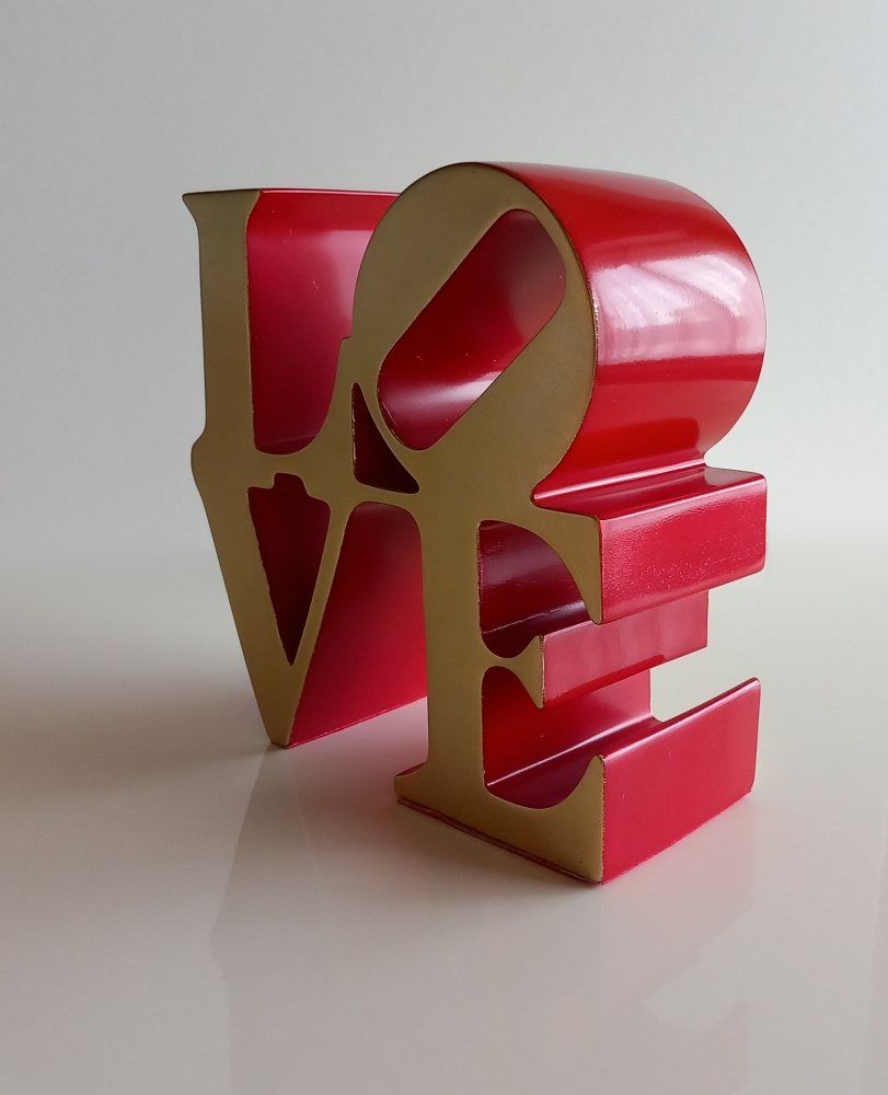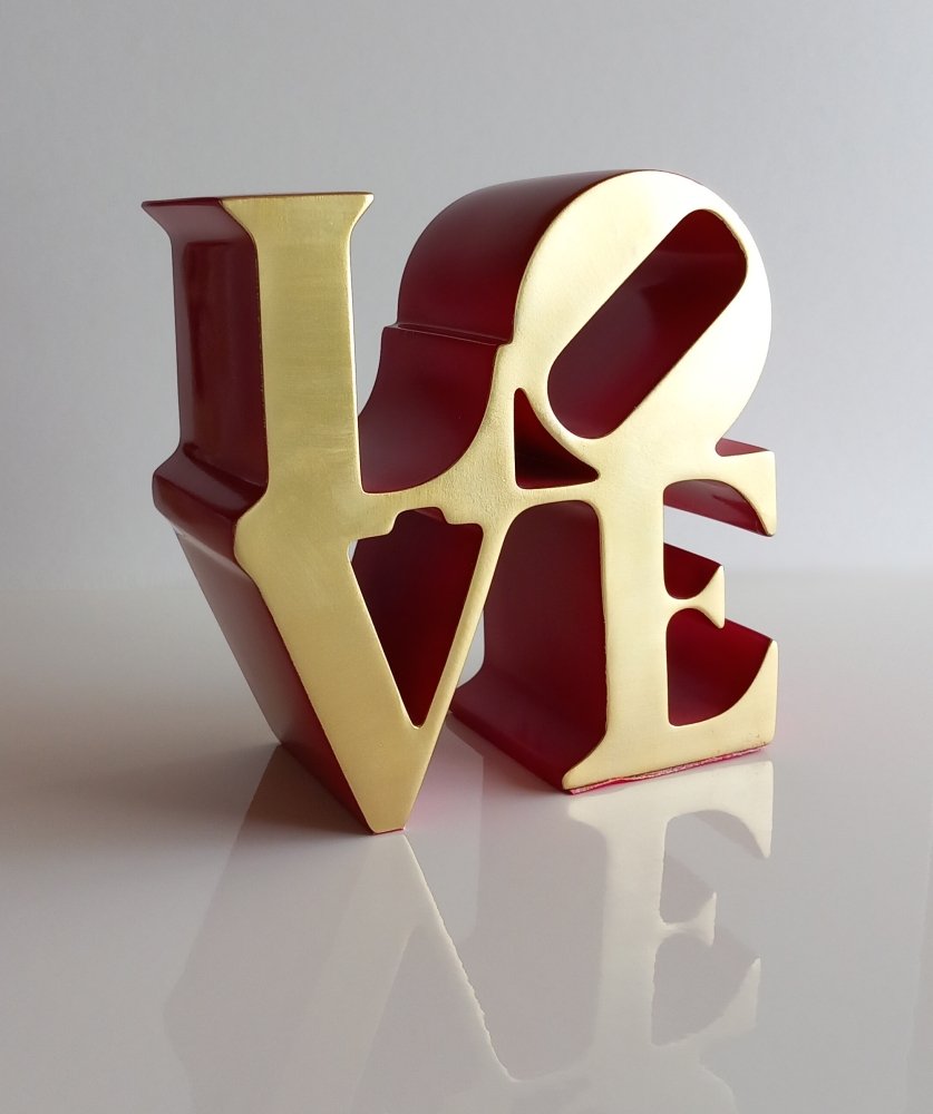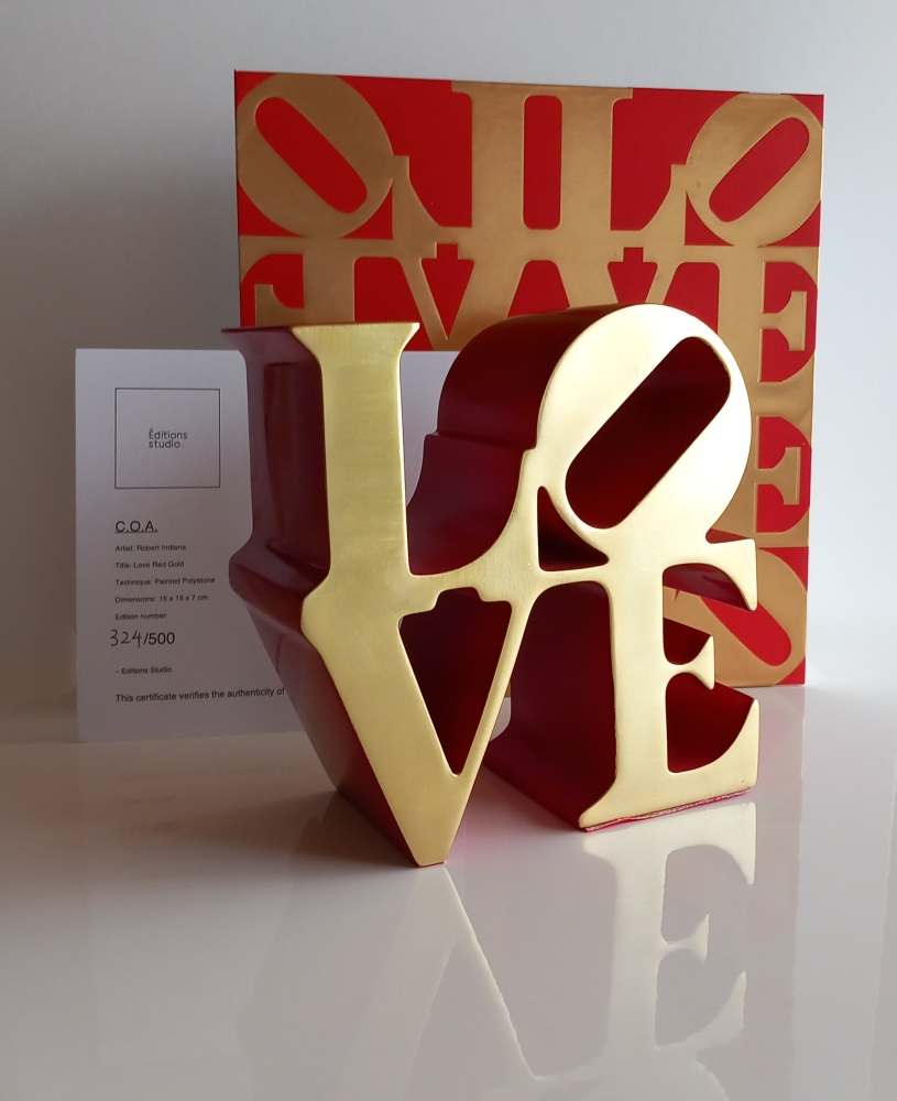 Resin sculpture released by Editions studio of Robert Indiana's "Love Red and Gold". Limited to 500 ex. of which this is no. 324. Comes with certificate in the original box. 15 x 15 x 7 cm (6 x 6 x 2,75). Mint condition. Few sculptures have captured hearts like this iconic LOVE sculpture. Although seemingly straightforward, the LOVE series continues to hold an important place in art history and in the hearts of people around the world.