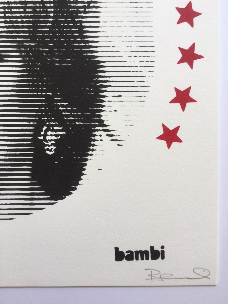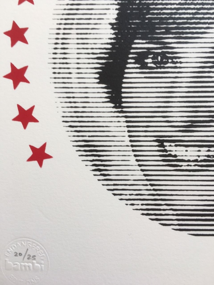 Lady Di 2-color screen print Edition of 25 Hand signed and numbered by Bambi 2020 'Lady Di' is the first work in Bambi's 'Weapon of Voice' Wonderful Women series. Bambi: This work is about amplifying the female voice at a time when women are openly bullied, dehumanized and threatened because of their political ideas, said Bambi. 30 x 30 cm COA (Certificate of Authenticity) available This screen print has always been stored flat, and is also shipped flat, with tracking.