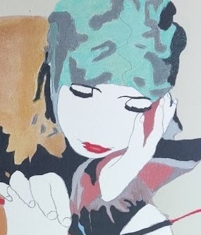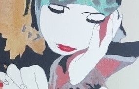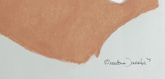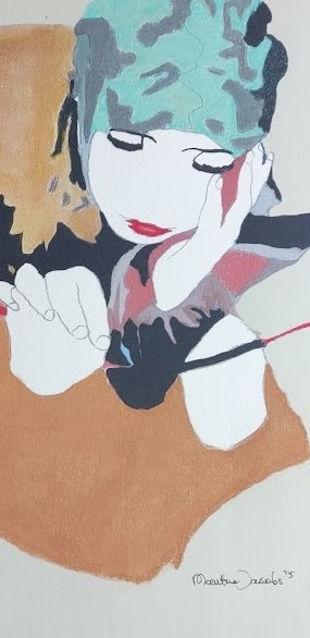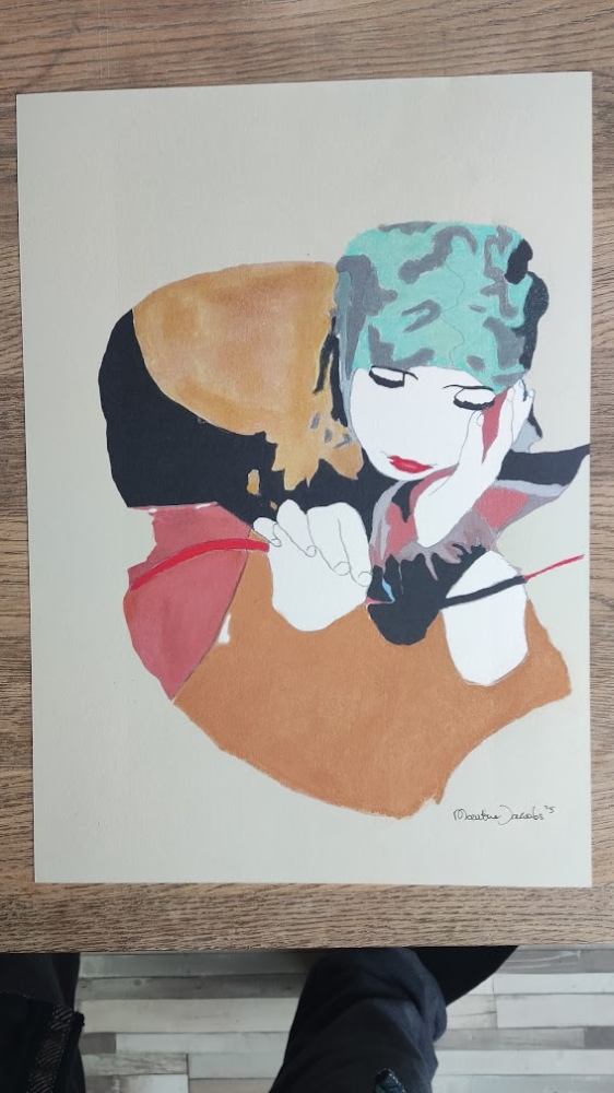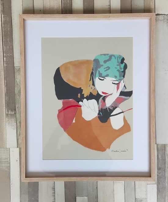 Martine Jacobs, geboren in 1956 Amsterdam, is een bekende pastelkunstenaar die zich heeft gespecialiseerd in het creëren van kleurrijke pasteltekeningen. Haar werk kenmerkt zich door levendige kleuren en de zachte, dromerige kwaliteit. Dit is een met pastelpotloden ingekleurde print . Het werk is ontworpen en ingekleurd door Martine Jacobs. Door de prints zelf in te kleuren, kan Martine haar eigen stijl, gevoel en emotie aan het werk toevoegen. Dit maakt elke print uniek en authentiek. De houding van het meisje zittend op haar knieën, in diepe gedachten verzonken geeft een introspectief en kwetsbaar beeld weer. De keuze voor pastel draagt waarschijnlijk bij aan de tedere uitstraling van het tafereel, met zachte kleuren en delicate lijnen die haar emotie en innerlijke reis benadrukken.