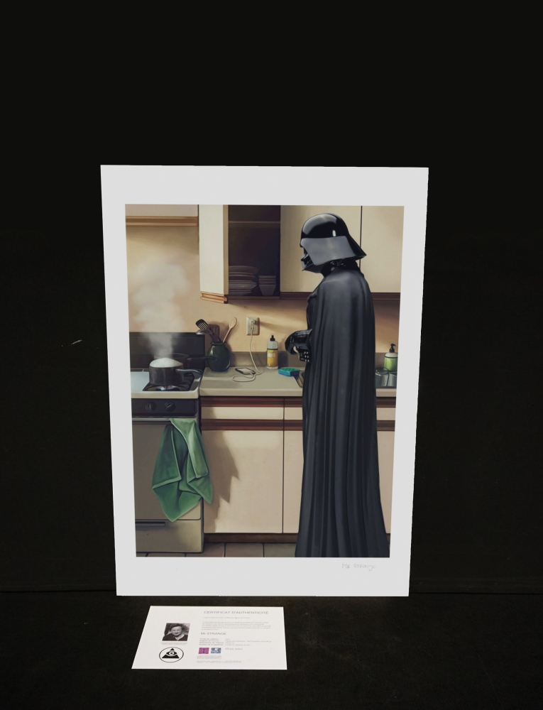 Mr Strange (Jean-Marie Gitard) est un artiste français engagé dans le surréalisme. Artiste côté et confirmé, il est présent dans de nombreuses collections en France et à l'étranger. Darth Vader's Al Dente Pasta - 2024 Giclée sur papier Hanhemühle. Epreuve 9/30 numérotée et signée à la main dans la marge blanche. Cachet de l'artiste embossé à sec. Envoyée avec un certificat d'authenticité. Dimension totale: 70 x 50 cm. Le bord blanc facilitera la mise en place de l'uvre dans un passe-partout. Neuve / jamais encadrée. Envoyée par transporteur dans un tube adapté.