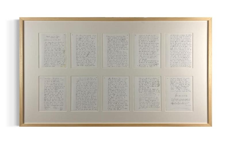Facsimile van het manifest Toymodel Of Space van Belgisch kunstenaar Panamarenko. Deze versie is de Franse versie van het manifest. Het werk werd professioneel ingelijst.