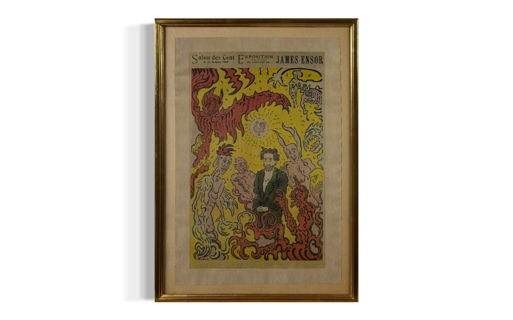Affiche James Ensor Salon Des Cent. Deze expositie ging door te Parijs in december 1898. Exposition de loeuvre de James Ensor. Professioneel ingelijst. Handtekening in de plaat.