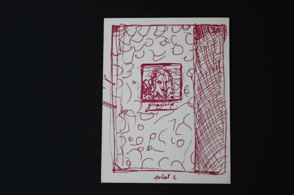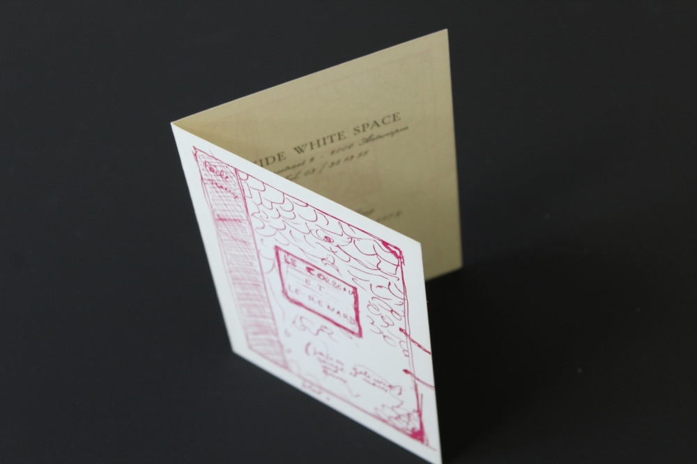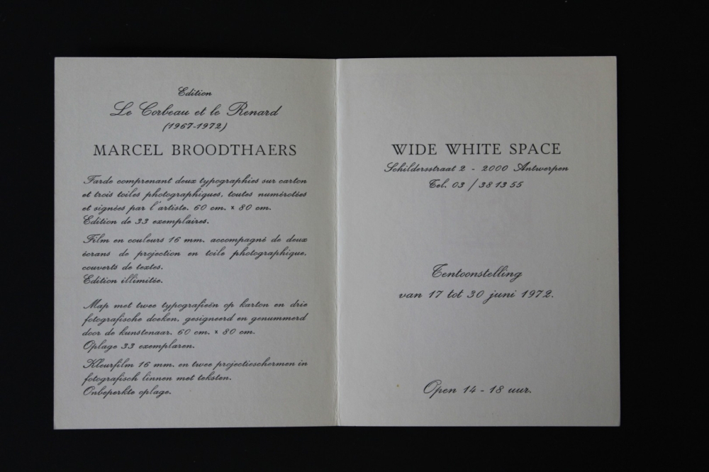 Le Corbeau et le Renard. Antwerpen, Wide White Space, 1972. Uitnodiging met reproductie van een tekening van Broodthaers op voor- en achterkant. Binnenzijde: informatie over de editie en de expo in de WWS. Gedrukt in rood en zwart. De eerste versie, op 40 exemplaren, verscheen in 1968. De tweede versie op 33 ex. in 1972. Eén van de moeilijkst te vinden Broodthaers-kaarten. Lit. Wide White Space, Achter Het Museum 1966-1976. Brussel: Vereniging voor tentoonstellingen van het Paleis voor schone kunsten te Brussel, 1994. page 289/item 057. Zeer goede staat, Nl-Fr., opengevouwen 20x14 cm