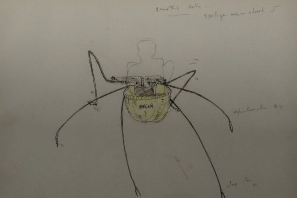 Met de hand gesigneerde pagina uit de kalender van 2004. De kalender werd destijds uitgebracht door galerij Ronny Van de Velde. Hiervan waren maar enkele exemplaren door Panamarenko met de hand gesigneerd. Het werk is ingelijst in een houten kader. Afmetingen van het kader zijn 65cm x 44cm. Boven op de spin is voor de bestuurder een rieten mandje met een kussentje voorzien als zitje. Hoewel de biologische spin uitgerust is met 8 poten, heeft de Aragna van Panamarenko er slechts 6.