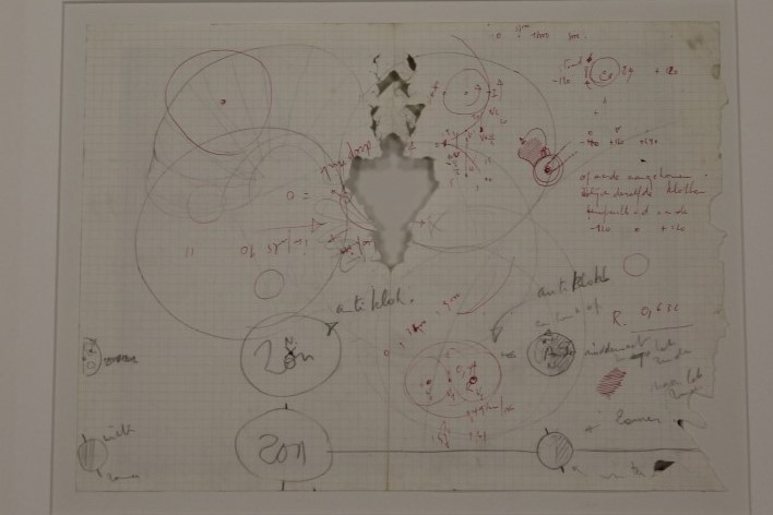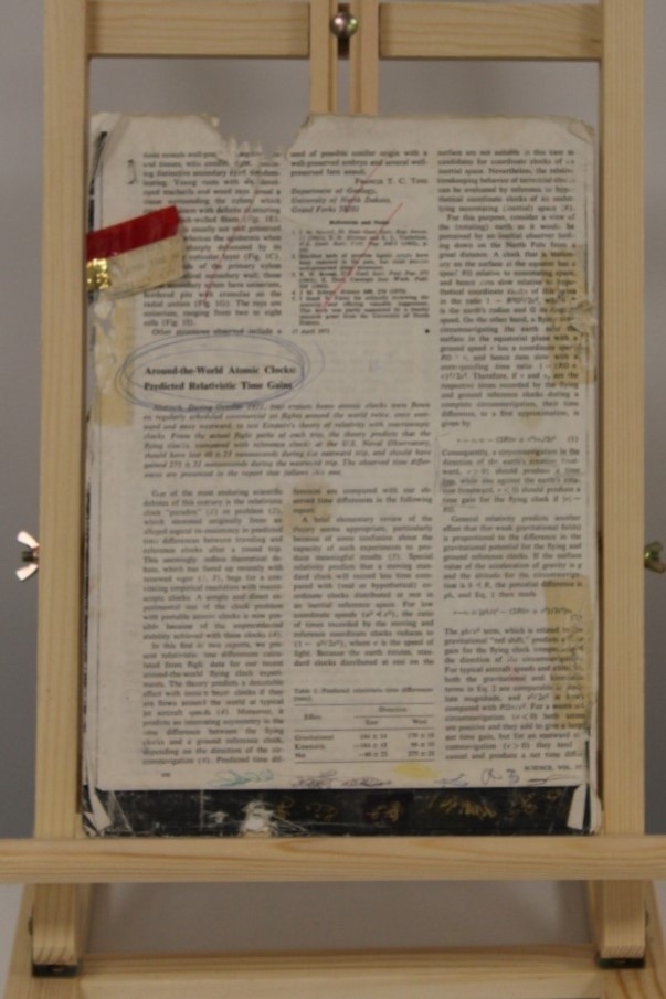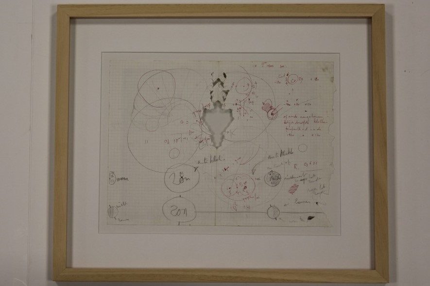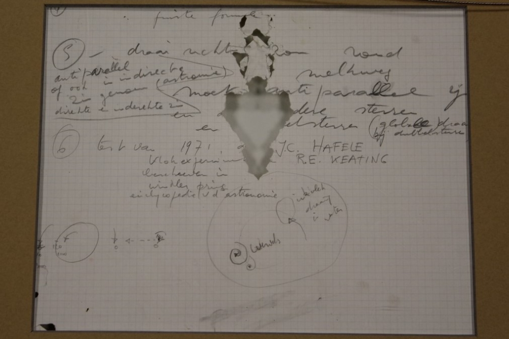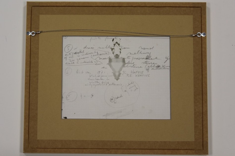 Originele handgemaakte schetsen en berekeningen recto en verso gemaakt in Panamarenko's atelier in de Biekorfstraat, alwaar pagina's geknabbeld werden op de vouwlijn door de inwonende papegaai, zie foto. Zeldzaam: onderwerp heel duidelijk aangegeven verso middels vermelding 'test van 1971 Klokexperiment J.C. HAFELE R.E. KEATING' verwijzend naar het bestaande klokexperiment (zie https://nl.wikipedia.org/wiki/Hafele-Keating-experiment - invloed van zwaartekracht op tijd studie). Geleverd met certificaat Ronny Van de Velde. Afkomstig uit belangrijk privé archief. In prof. kader met verso uitsparing. We voegen toe (zie onder andere foto 2): werkdocument bundel met onderstrepingen, aantekeningen, krabbels van Panamarenko op 4 pagina's over hetzelfde Klokexperiment van J.C. HAFELE R.E. KEATING (zie ook rood/wit lintje aan bundel). Uiteraard met verzekerde verzending (voorkeur echter voor afhaling)