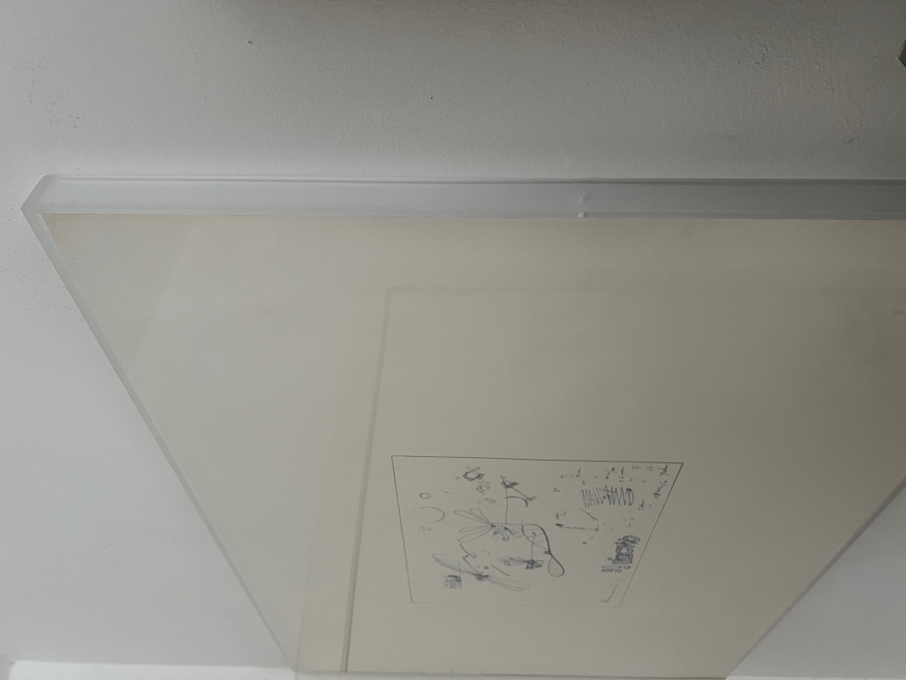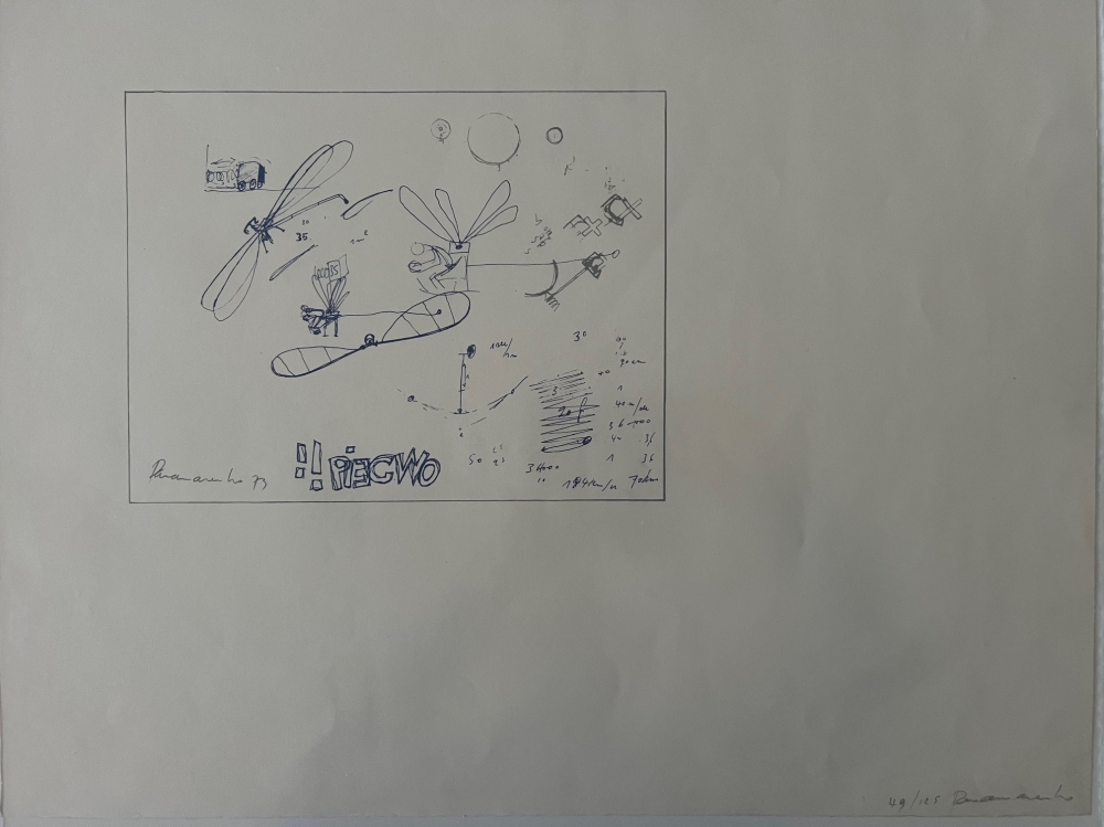 Originele zeefdruk van Panamarenko Gesigneerd en genummerd in potlood Editie van Panamarenko uitgegeven op 125 exemplaren. Het werk Piegwo is een viervleugelige Meganeudon. Men lette op het karretje in de linkerbovenhoek. Dit wagentje beschikt over een grote drukkracht, maar kleine snelheid. Het spant een veer op, zodat het nadien een grote snelheid kan ontwikkelen. De vleugels van de Meganeudon worden opengekwakt (snelheid) door een veer, die wordt opgespannen door de trappende piloot (drukkracht). (Zie ook multiple nr. 21.)werk werd met de hand gesigneerd en genummerd. De zeefdruk is vrij van vlekken of plooien , wel wat deukjes hier en daar zie foto's. Ingekaderd in plexi , uitstekende staat en krasvrij.