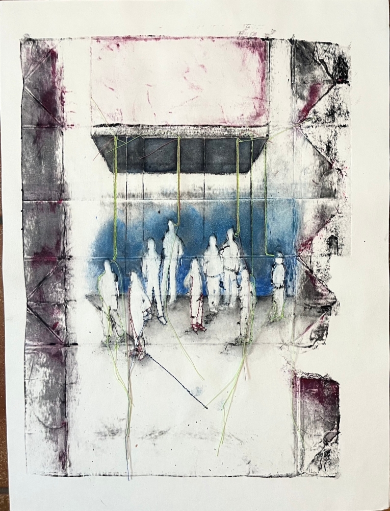 Dit werk is een ets op papier waarop ook werd gestikt om het speelser te maken. Daardoor kon ik ook meer accenten leggen. Met aquarelverf werd er meer kleur aan het werk gegeven. Het werk is geperst op karton en ingelijst in een houten kader met een passe partout. Het hoofd van de figuren zijn verbonden met een pijler waarin de gedachten vervoerd worden naar een universum. Daarin hebben alle gedachten een bestaansrecht. Ze zijn er vrij. Eén figuur heeft geen pijler. Wordt de figuur bedreigd in haar vrije mening of wordt ze net ondersteund om sterker te worden in de zoektocht naar een vrije meningsuiting?