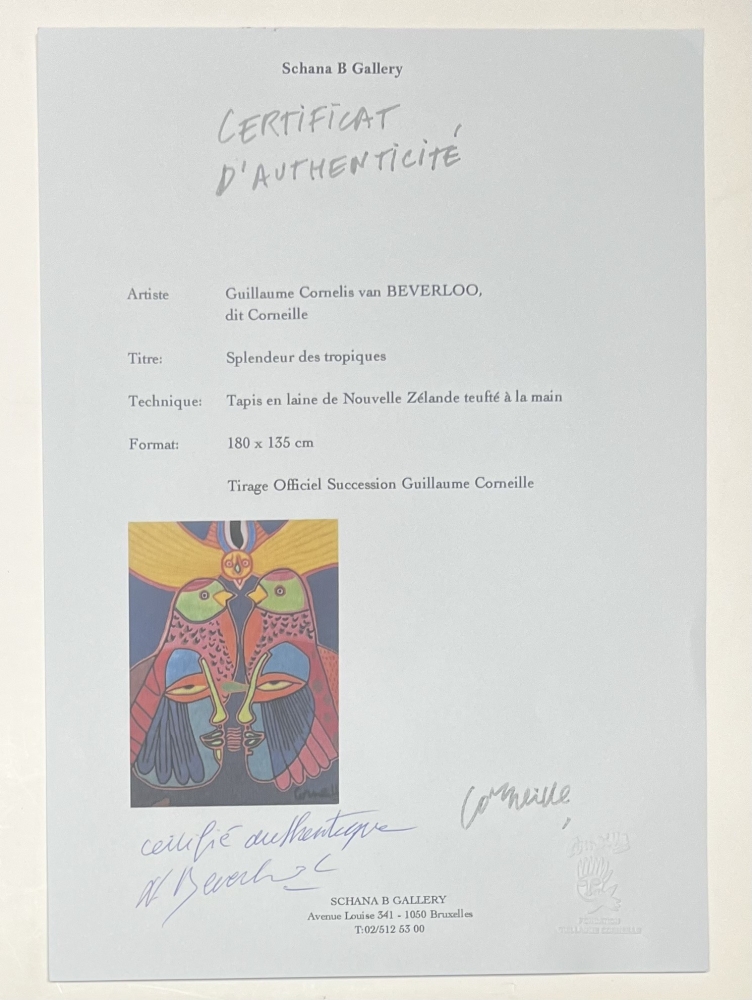 Superb hand-tufted New Zealand wool rug in mint condition, delivered with a certificate of authenticity. Size : 180 x 145 cm. This rug can be placed on the floor or hung on a wall. Guillaume Corneille, born in Liège of Dutch parents, was one of the founding members of the Cobra group (Contraction of Copenhagen, Brussels, Amsterdam) with Karel Appel, Christian Dotremont, Asger Jorn, Constant, and then Alechinsky, among others.
