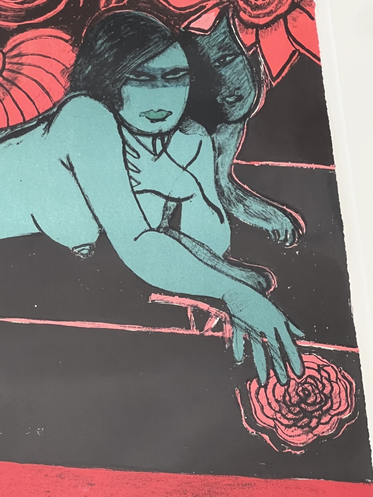 A beautiful and unusual work from 1980. Behind a totem pole, typical of primitive art, a female model reclines on a sofa, accompanied by mirrored cats, in a floral setting. Guillaume Corneille, an erudite painter, has created a work that pays tribute to the painters Matisse and Gauguin, both in terms of colour and theme. Lithograph signed, titled and dated at the top by the painter. Overall dimensions: 54.5 x 69.5 cm. Total dimensions: 83 x 99 cm. The frame dates from the time of Corneille and shows some wear to the corners. Secure shipping in a box by UPS. Guillaume Corneille retrospective in Belgium in 2024!