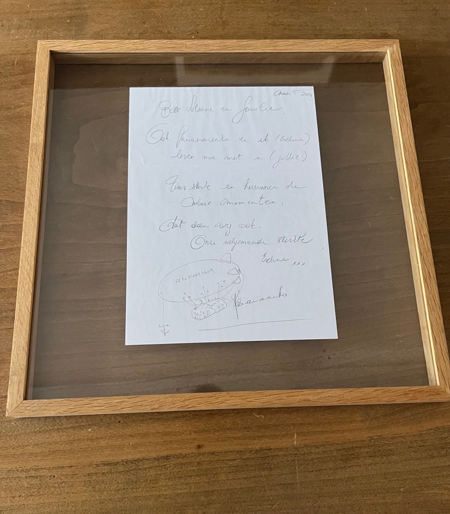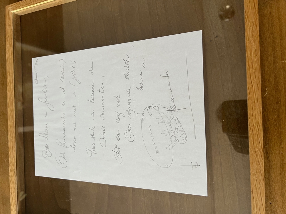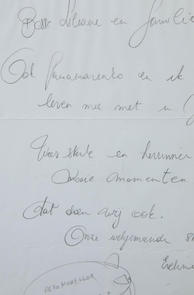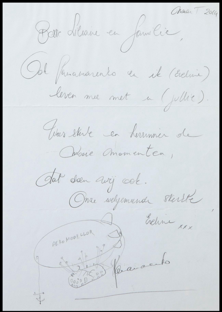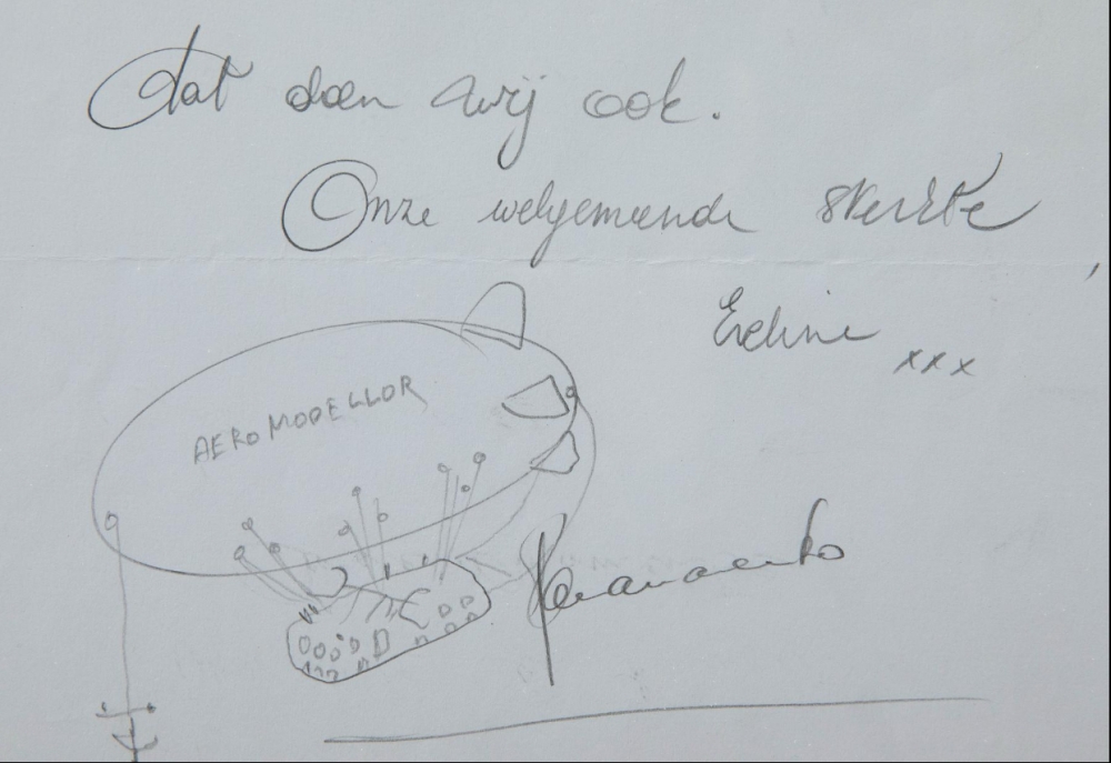 Brief met originele tekening uit de nalatenschap van 'kunstpaus' Jan Hoet (1936-2014) . Handgeschreven brief in potlood met mooi tekening van de aeromodeller. In mooi houten kader geplaatst tussen twee glasplaten. De Aeromodeller (1969-71), een van Panamarenkos meest legendarische luchtschepen, bestaat net zoals zijn latere zeppelinprototypes uit drie delen: een ballonvormig drijflichaam, gemaakt van lange aan elkaar gekleefde stroken pvc; een constructie met propellers en motoren voor voortstuwing en besturing; en een gondel, opgevat als woonruimte, vervaardigd uit een buigzame in het zilver gespoten rietsoort. De naam van het luchtschip ontleende Panamarenko aan een Engels tijdschrift voor modelbouwers en maakte hij officieel met de toevoeging 00-1PL (00 voor de wettelijke identificatie van Belgische vliegtuigen, en 1PL voor 1ste Panamarenko Luchtschip).