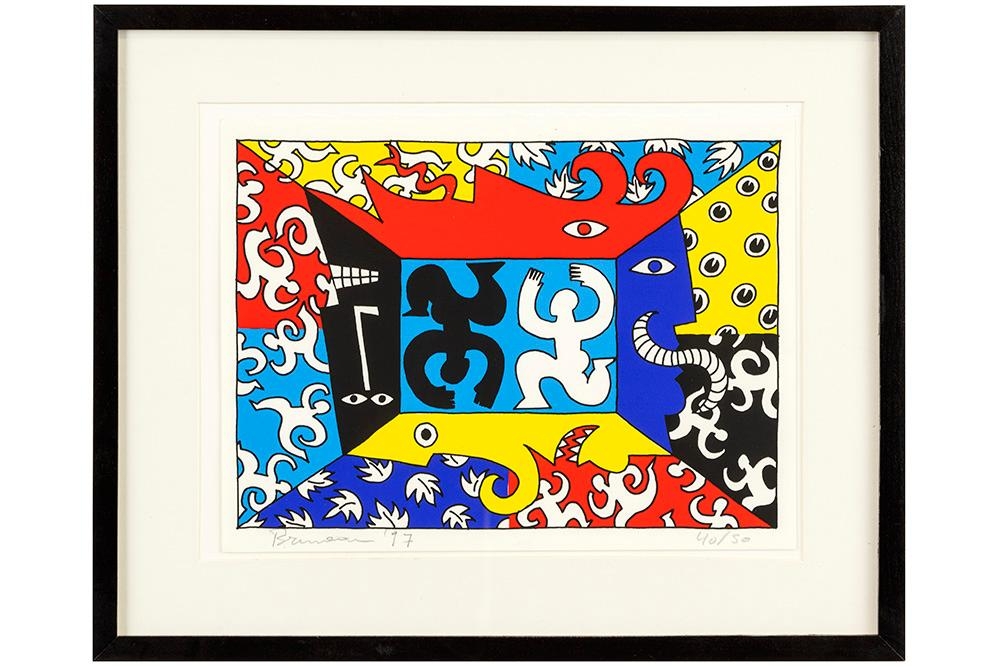 RUNEAU (1957-2025) color lithograph n° 40/50 titled: "Pablo" - 28 x 37 signed and dated '97 Bruneau often works with gouache or marker on paper, and has a strong preference for drawings and watercolors. His work is characterized by a playful, cartoonish slant references to comics and cartoons are clearly present. Recurring themes: simple objects (such as chairs or hats), character heads, portraits of philosophers/artists, and often a positive note or humorous element