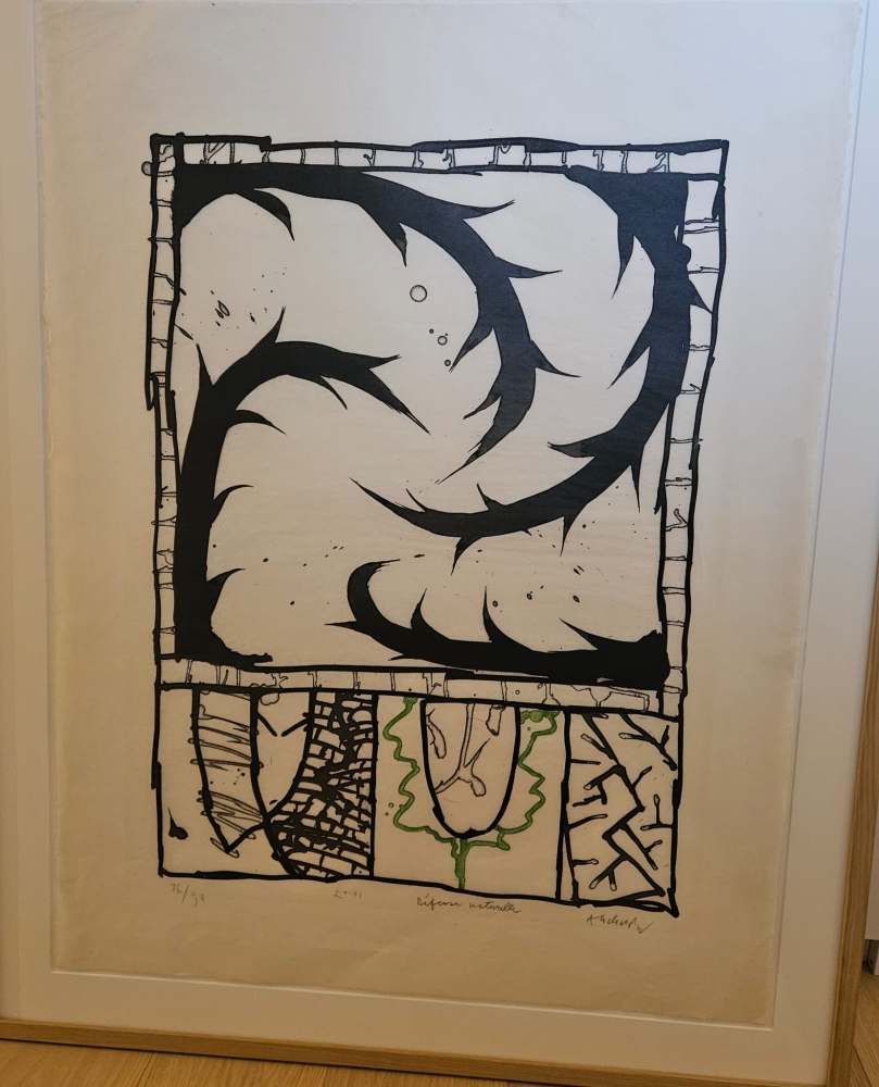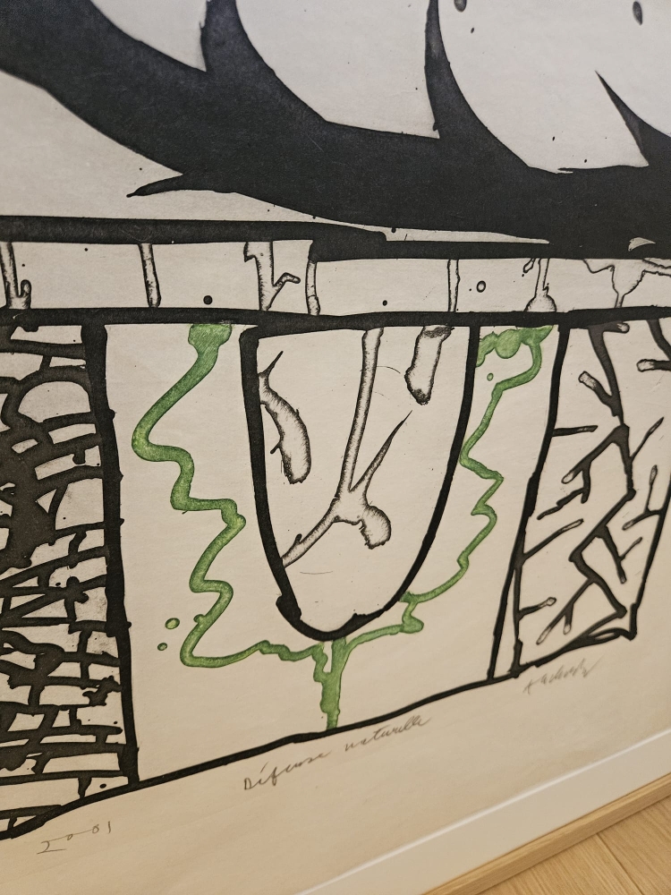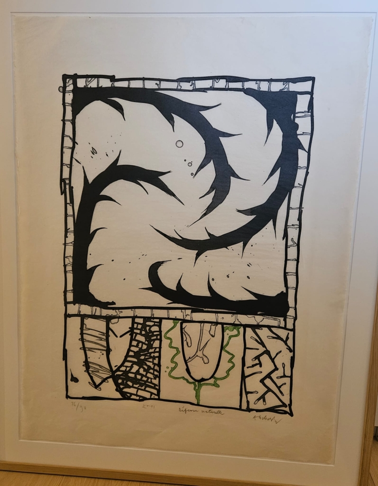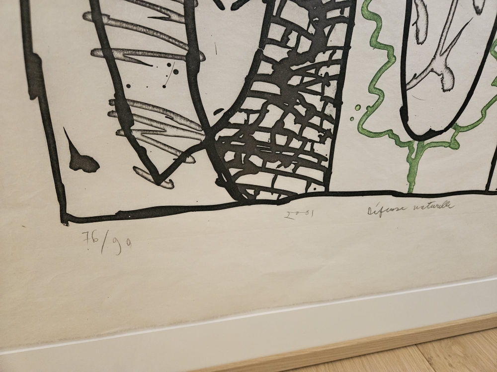 Pracht groot werk van Pierre Alechinsky. Getiteld: Défense Naturelle. Ets/Aquating op heel fijn papier Japonais. Het werk is met de hand gesigneerd, genummerd (editie op slechts 90 exemplaren), getiteld en gedateerd Het werk is momenteel eveneens ingelijst (zonder glas)
