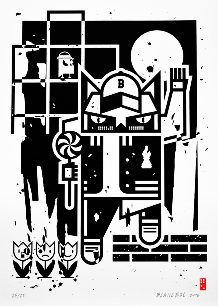 Zeefdruk Blancbec, gesigneerd en genummerd op 25 exemplaren. De rode stempel werd er met de hand op aangebracht. Eén exemplaar werd opgenomen in de vaste collectie van het museum Centre de la gravure in La Louviere Blancbec:De naam van deze editie verwijst naar Joseph Poelaert. Hij is de architect van het Justitiepaleis. Voor de bouw van dit gebouw moest een deel van de wijk de Marollen gesloopt worden. Daardoor was Joseph Poelaert niet echt populair in Brussel en kreeg hij de naam Skieven Architek.