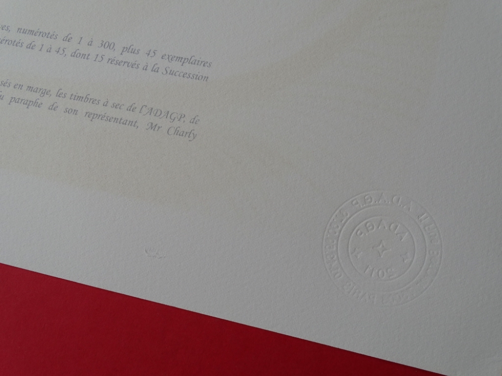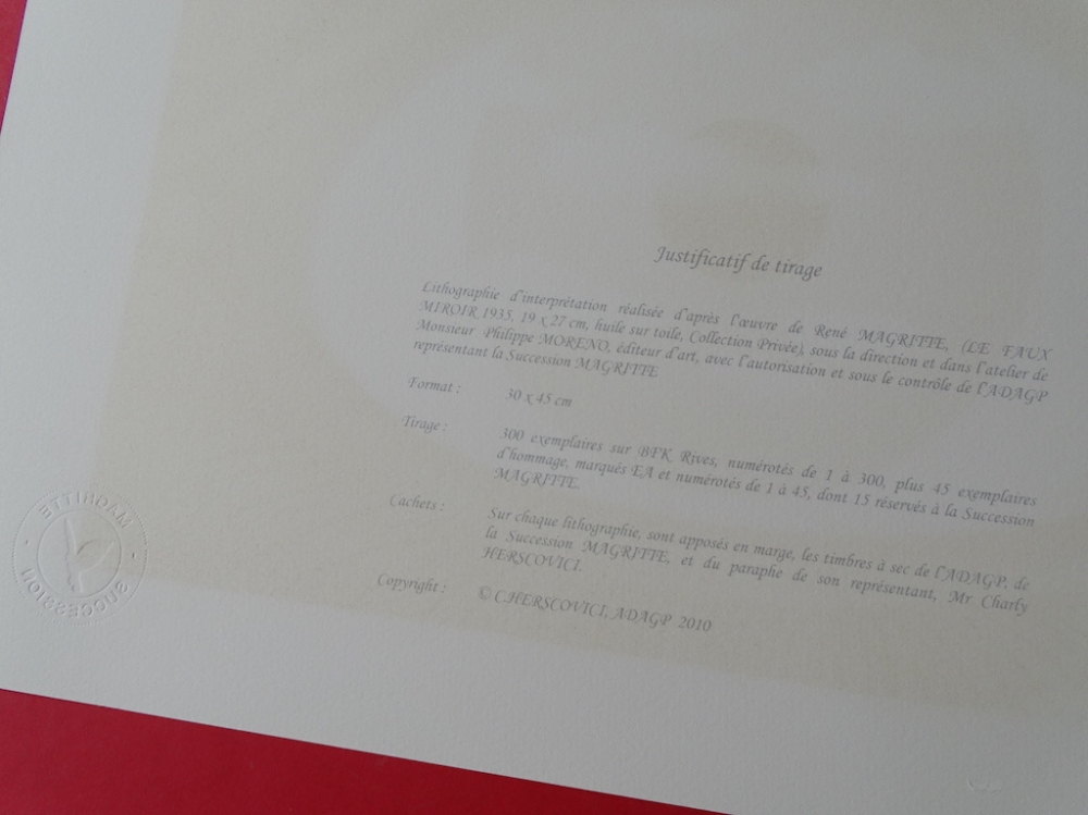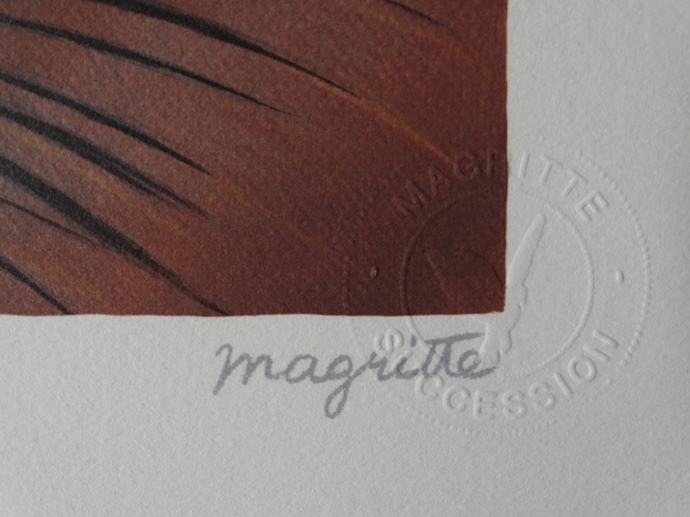 Very beautiful and colorful color lithograph (2010) released by Philippe Moreno's studio with permission and under the control of the ADAGP, which represents the legacy of René Magritte. Magritte's signature is printed. The work has been paragraphed by Charly Herscovici, representative of the Magritte estate. The work is numbered and also contains embossing stamps from the publisher ADAGP and the estate of Magritte. The work has never been framed and is in very good condition. The gallery price for this work is 1000 to 1500 euros.