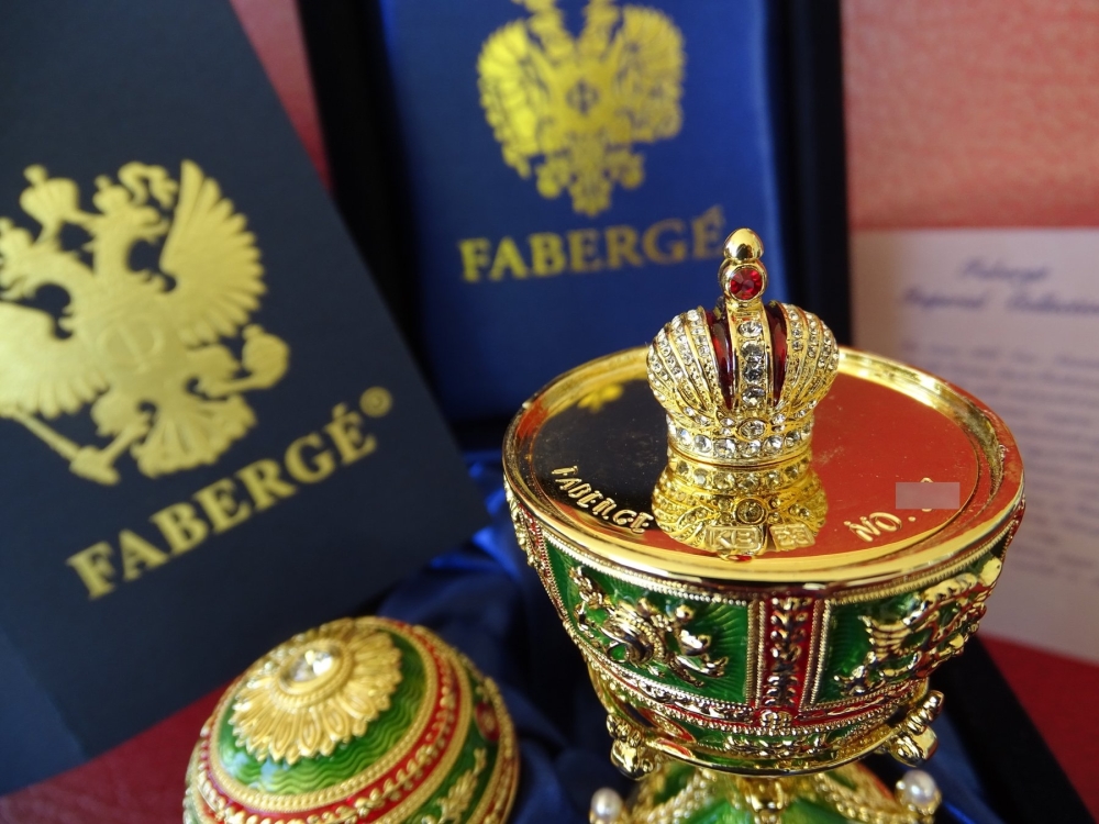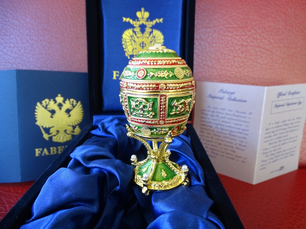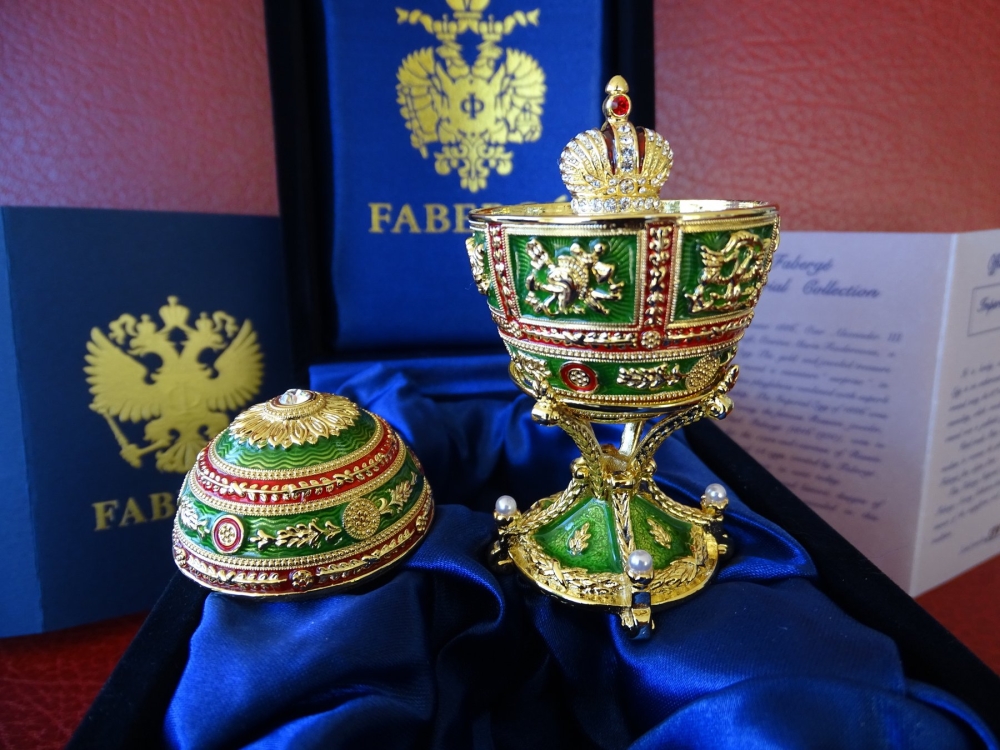 House of Faberge - Imperial Egg- Pendant inside, fully hallmarked, Certificate of Authenticity included - Enamel House of Faberge Imperial egg with COA - Certificate of Authenticity- 24 k gold finish - Enamel This is a limited edition, very rare to be found enamel with a 24 k gold plated finish Dimensions of the egg and base ca 9 cm The Fabergé family originated in France but was forced to leave the country due to religious persecution. During the 18th century, the family settled in Russia. Peter Carl Fabergé was born on May 30, 1846, the son of a goldsmith. After apprenticing with several master goldsmiths in Germany, France and England, Peter Carl Fabergé returned to St. Petersburg a highly accomplished craftsman. In 1885, Peter Carl Faberge presented the first Imperial Egg to Czar Alexander III and soon became the most famous jeweler in the world. Investing in Faberge is as good a idea as the investments in gold bullion or even the investment in art by great artists such as Warhol, Chillida, Roy Lichtenstein Basquiat or Banksy.