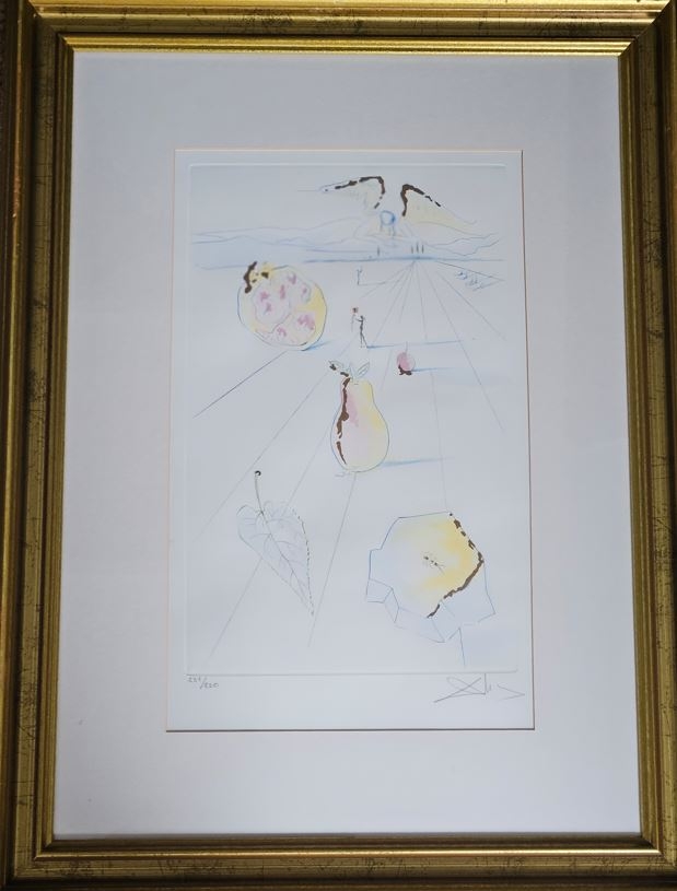 Signed and numbered in pencil below left and right corner to /250 exemplaires, 100 & 130 original & 1 authentic because of the Dali crown watermark in the lower left corner on verso. From his 1971 Song of Songs series. Both manually finished with gold dust & color stenciling. titeld : Thou art fair my love Both are published (=with photos and descriptions) in the catalogue raisonnee of Dali his graphic works. Titeld : The fruits of the valley Galery and/or auction values = circa 5000 US $.