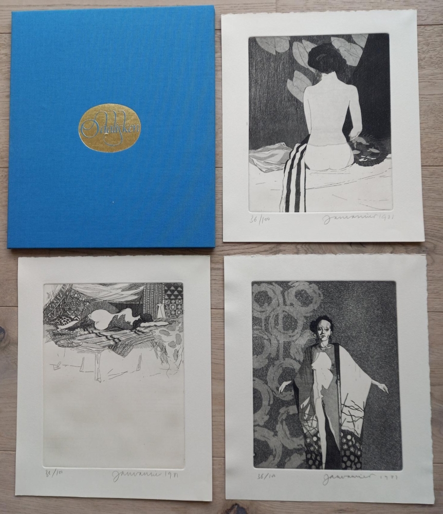 Het betreft hier een linnen beklede box waarin twee afzondelijke delen zitten. Het enen betreft een uitgave met afbeeldingen van 15 aquarellen van Jan Vanriet en poëtische notities van Nic van Bruggen. Het tweede deel bevat drie koperplaat etsen die telkens door de kunstenaar gesigneerd zijn en het nummer 36/100 kregen. Deze box ende etsen zijn in perfecte staat.