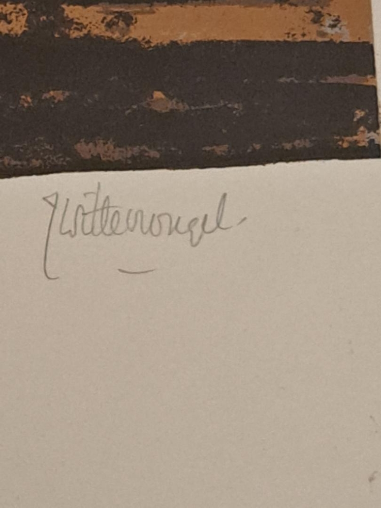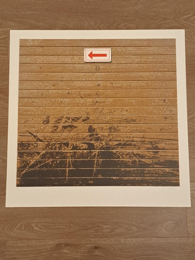 typische hyperrealistische zeefdruk van Roger Wittevrongel. Muren/plankenwanden/garagepoorten waren één van zijn vaak terugkerende onderwerpen in de jaren '70/'80 Deze zeefdruk is afkomstig uit de map "Vlaamse Kunst 1975", uitgegeven door Dobbelhoef, Kessel