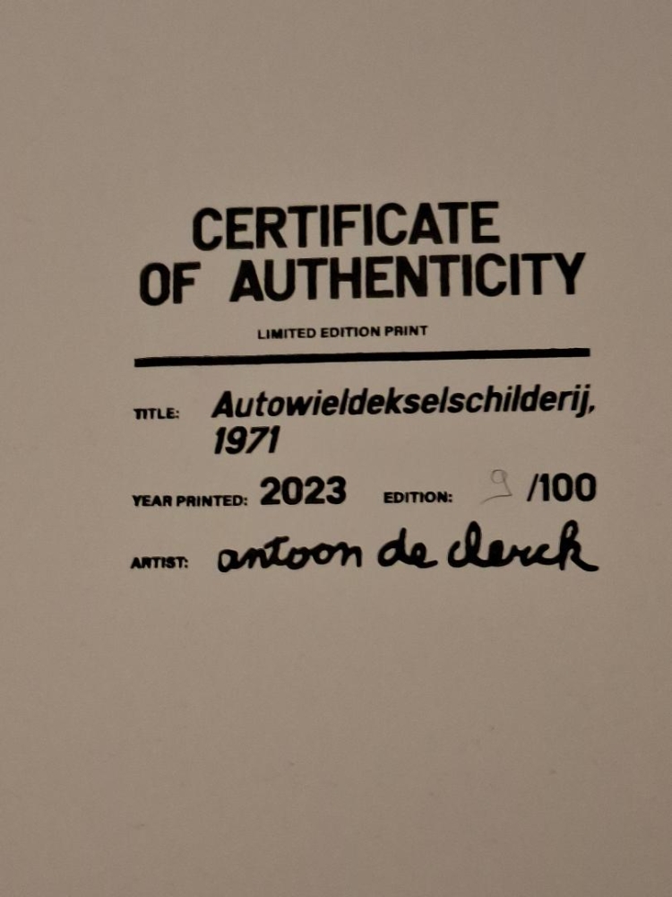 screen print after the painting of the same name from 1971 on the occasion of the retrospective exhibition Antoon De Clerck "Visual hygiene" in the Mudel in Deinze. Childhood friend of Roger Raveel. Starting from the New Vision, Antoon De Clerck has developed his own realistic way of painting with certificate printed on the reverse of the page