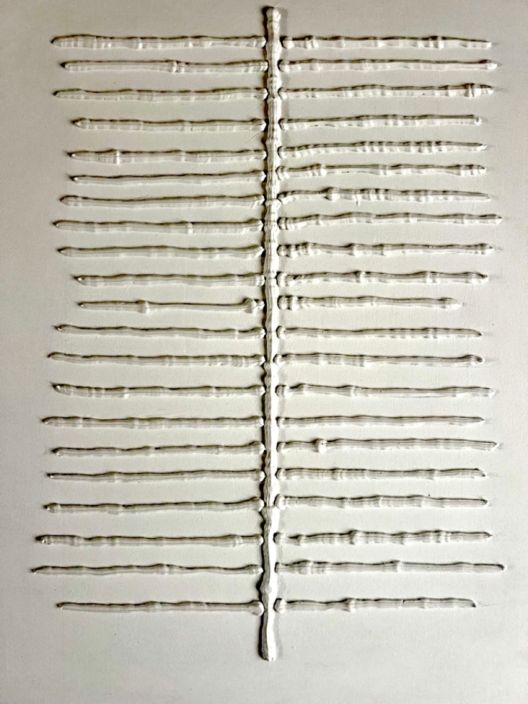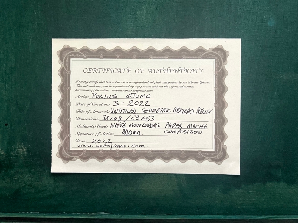 This monochrome relief by Ojomo emphasizes rhythm, structure and silence. The repeating lines create a clear, minimal tension, while the subtle irregularities give the work its tactile presence. The combination of sobriety, relief and precise lines results in a powerful, contemporary minimalist work with a strong spatial effect. The work comes with a Certificate of Authenticity signed by the artist. Portus Ojomo is a Belgian-Nigerian artist trained in monumental arts. His work is characterized by minimal structures, tactility and a pure, contemporary design language