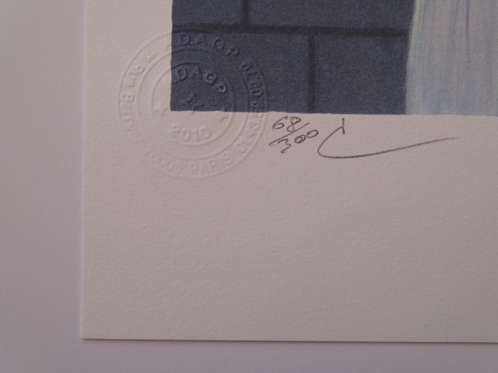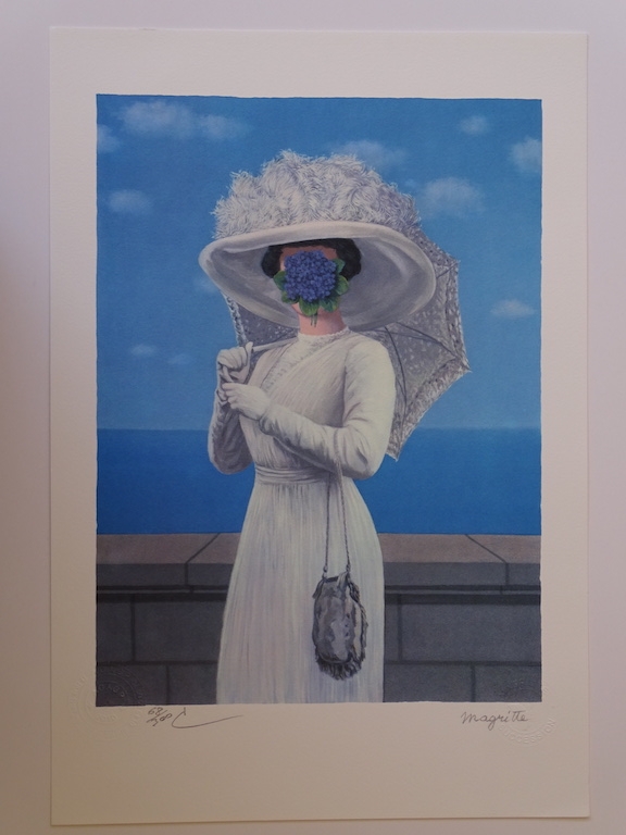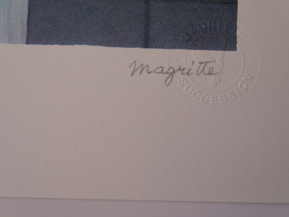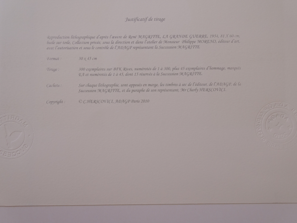 Very beautiful and colorful color lithograph (2010) released by Philippe Moreno's studio with permission and under the control of the ADAGP, which represents the legacy of René Magritte. Magritte's signature is printed. The work has been paragraphed by Charly Herscovici, representative of the Magritte estate. The work is numbered and also contains embossing stamps from the publisher ADAGP and the estate of Magritte. The work has never been framed and is in very good condition. The gallery price for this work is 1000 to 1500 euros.