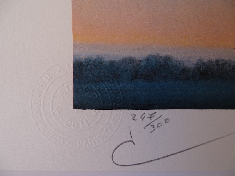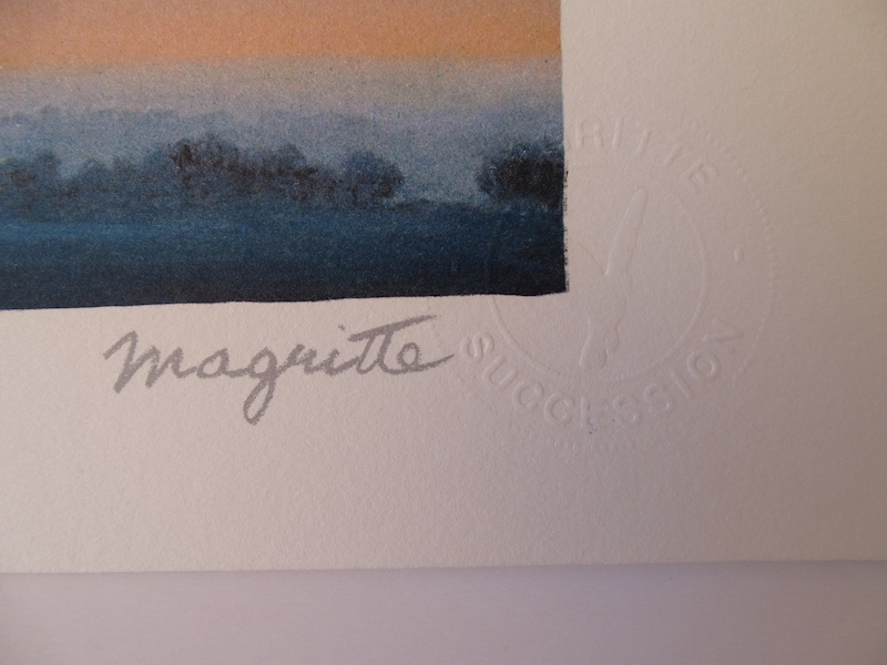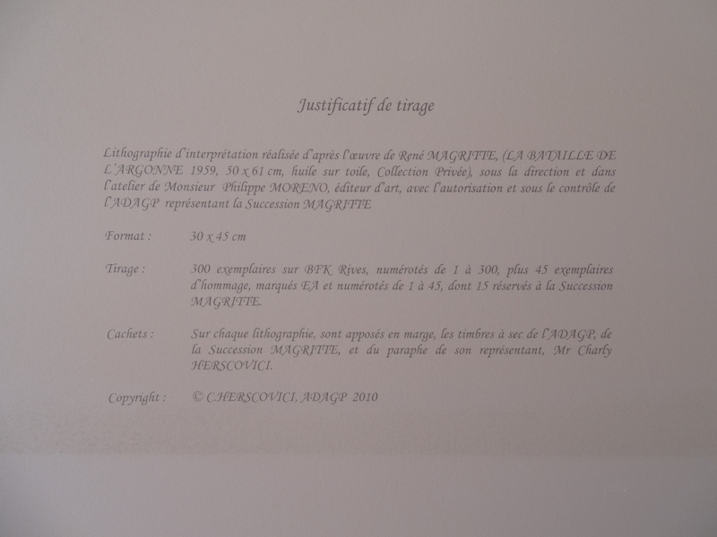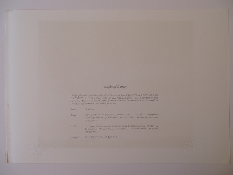 Very beautiful and colorful color lithograph (2010) published by the workshop of Philippe Moreno with authorization and under the control of the ADAGP, which represents the legacy of René Magritte. Magritte's signature is printed. The work was paragraphed by Charly Herscovici, representative of the Magritte estate. The work is numbered and also includes embossing stamps from the publisher ADAGP and the Magritte estate. The work has never been framed and is in very good condition. The gallery price of this work is 1000 to 1500 euros.
