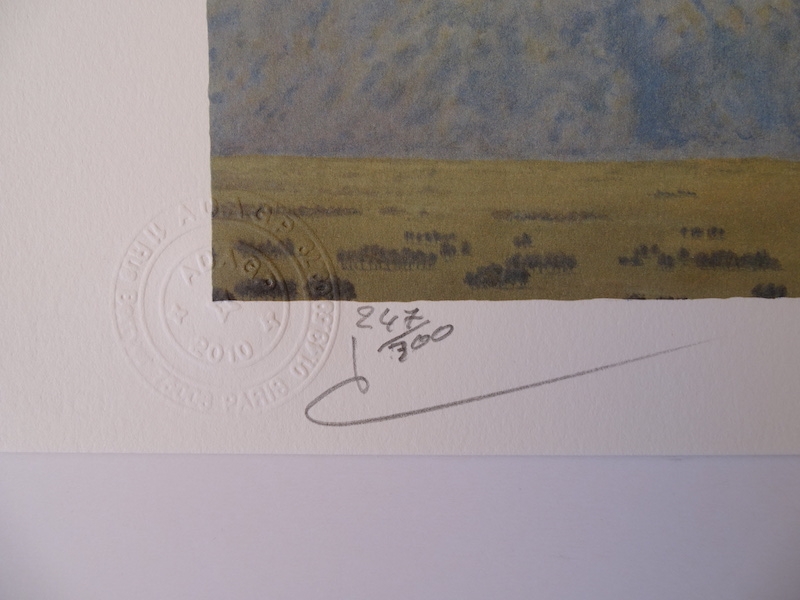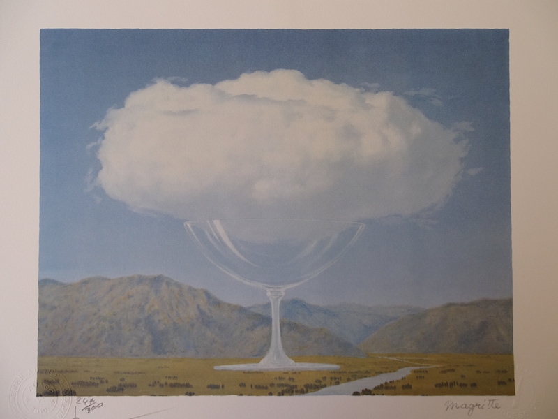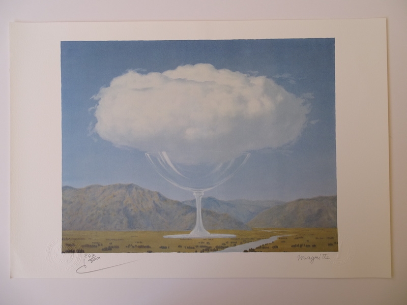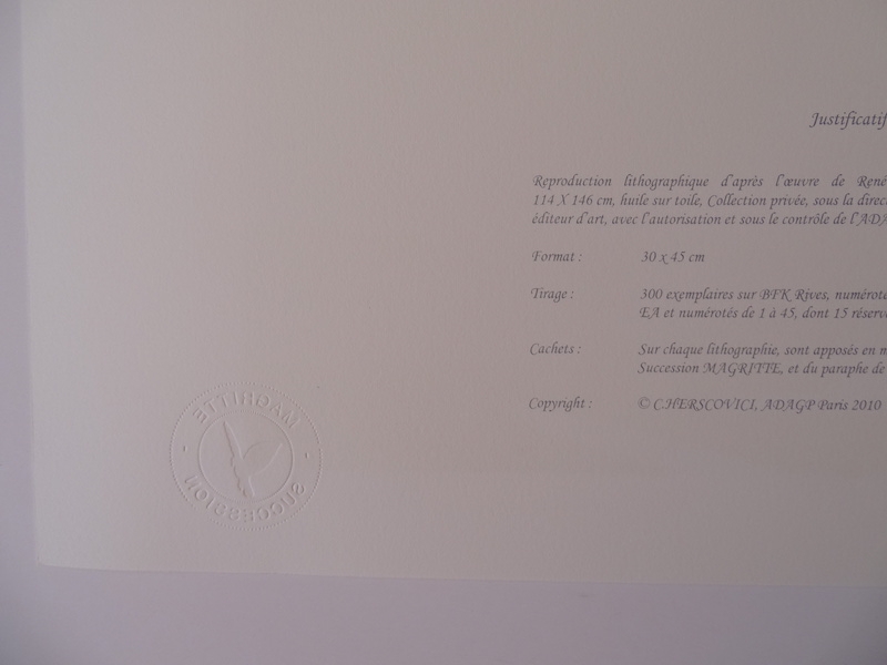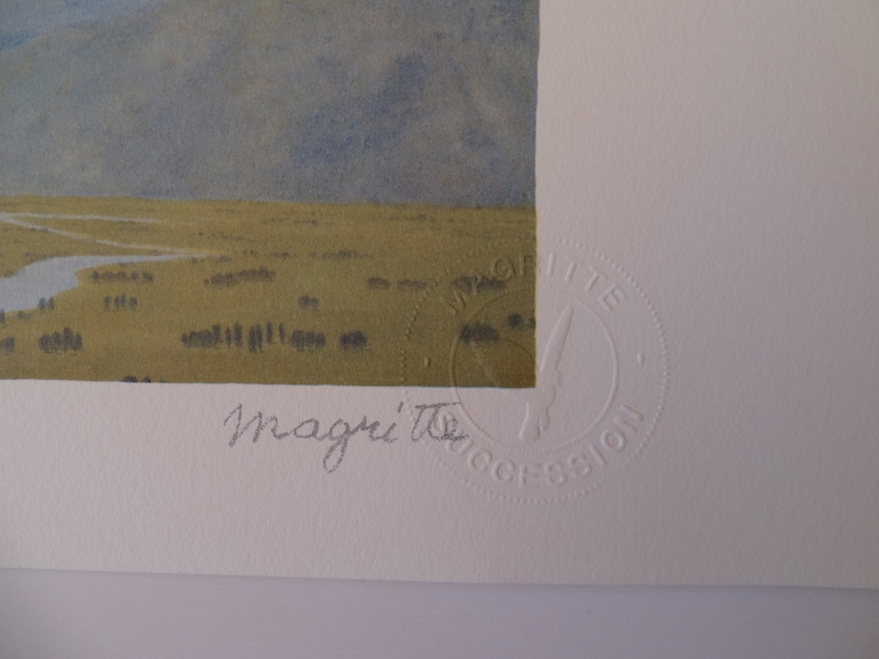 Very beautiful colored and colored lithograph (2010) published by the studio of Philippe Moreno with the permission and under the control of the ADAGP, which represents the heritage of René Magritte. Magritte's signature is printed. The work was initialed by Charly Herscovici, representative of the Magritte estate. The book is numbered and also contains embossing stamps from publisher ADAGP and Magritte's estate. The work has never been framed and is in very good condition. The gallery price for this work is 1000 to 1500 euros.