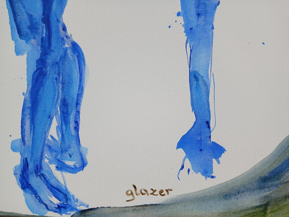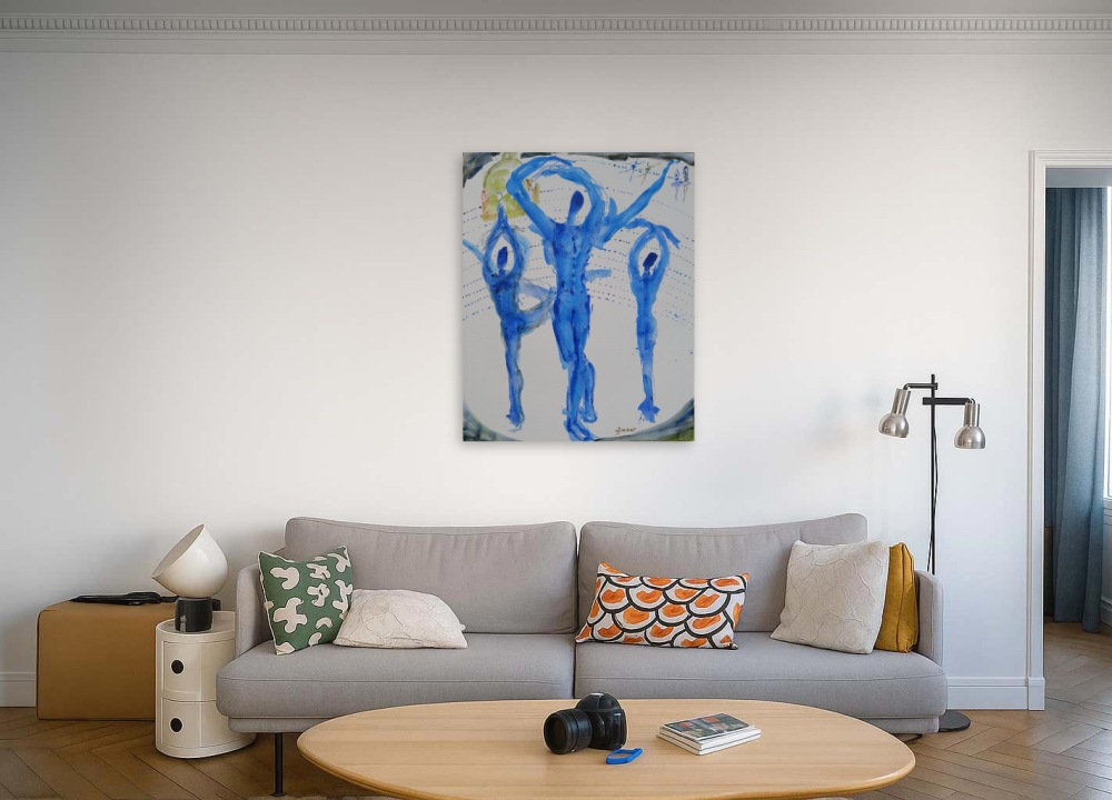 This artwork presents an evocative dance scene, dominated by three fluid, abstract figures striking dynamic poses. Rendered in shades of vibrant blue, the figures gracefully stretch upward, suggesting movement and harmony. They are set against a stark white background, enhancing the ethereal quality of their forms. Delicate dotted lines arc across the canvas, reinforcing the sense of rhythm and fluidity reminiscent of a musical score or choreography. A faint structure looms in the top left, adding intrigue and a sense of place. This composition merges simplicity with complexity, capturing the essence of dance through minimalistic brushstrokes. The choice of monochrome blue imbues the scene with tranquility and depth, inviting viewers to interpret the dancers' emotions and stories. Overall, this piece impressively conveys motion and emotion through its balanced composition and artistic restraint.