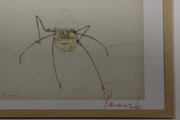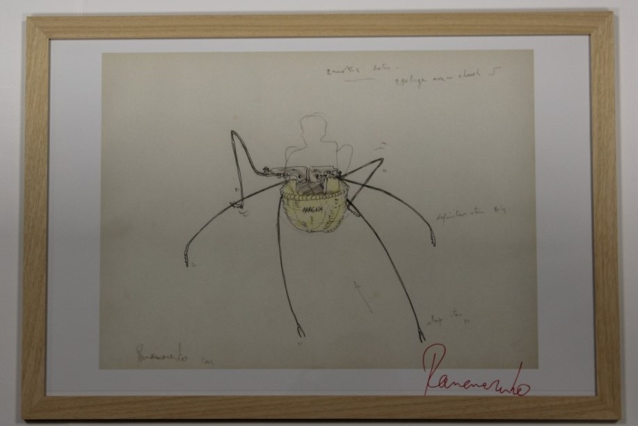 Met de hand gesigneerde pagina uit de kalender van 2004. De kalender werd destijds uitgebracht door galerij Ronny Van de Velde. Hiervan waren maar enkele exemplaren door Panamarenko met de hand gesigneerd. Het werk is ingelijst in een houten kader. Afmetingen van het kader zijn 65cm x 44cm. Boven op de spin is voor de bestuurder een rieten mandje met een kussentje voorzien als zitje. Hoewel de biologische spin uitgerust is met 8 poten, heeft de Aragna van Panamarenko er slechts 6.