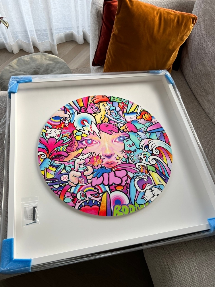 Dark Side Of The Rainbow is een limited edition zeefdruk van 44 stuks. Print werd verkocht aan 10.000 USD, zeer zeldzaam gezien beloning voor NFT eigenaars van dit werk. Hier wordt het exemplaar 19/44 verkocht, dewelke met de hand gesigneerd is door VEXX. Ingelijst met ontspiegeld glas 2mm 70% UV, rond werk - zwevend in kastkader. (professioneel door ArtFrameCenter Brugge) Indien u de NFT ook wenst, kan dit besproken worden. (zie https://raw2.seadn.io/ethereum/0x34b29253499265bbe843fdc4936cce48b1ec5fa5/e28de1114be1e1892d0a8bf9682e6b/f7e28de1114be1e1892d0a8bf9682e6b.mp4)