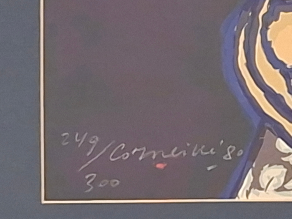 Colorful lithograph by Corneille as part of/sequel to his New York rooms series in the late 1970s/early 1980s, each showing an interior and one or more naked women. Despite publication of 300 copies, a rarely offered work. possibly original framing, work not examined outside the frame Signed, numbered, and dated in white pencil or chalk.