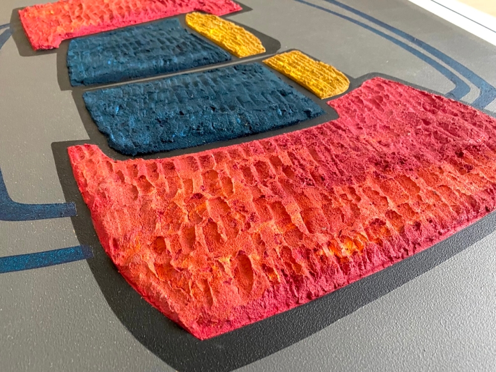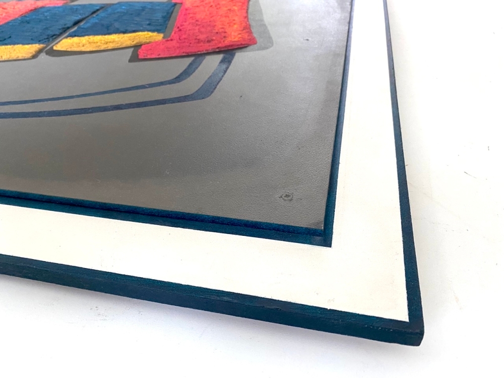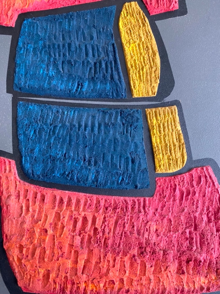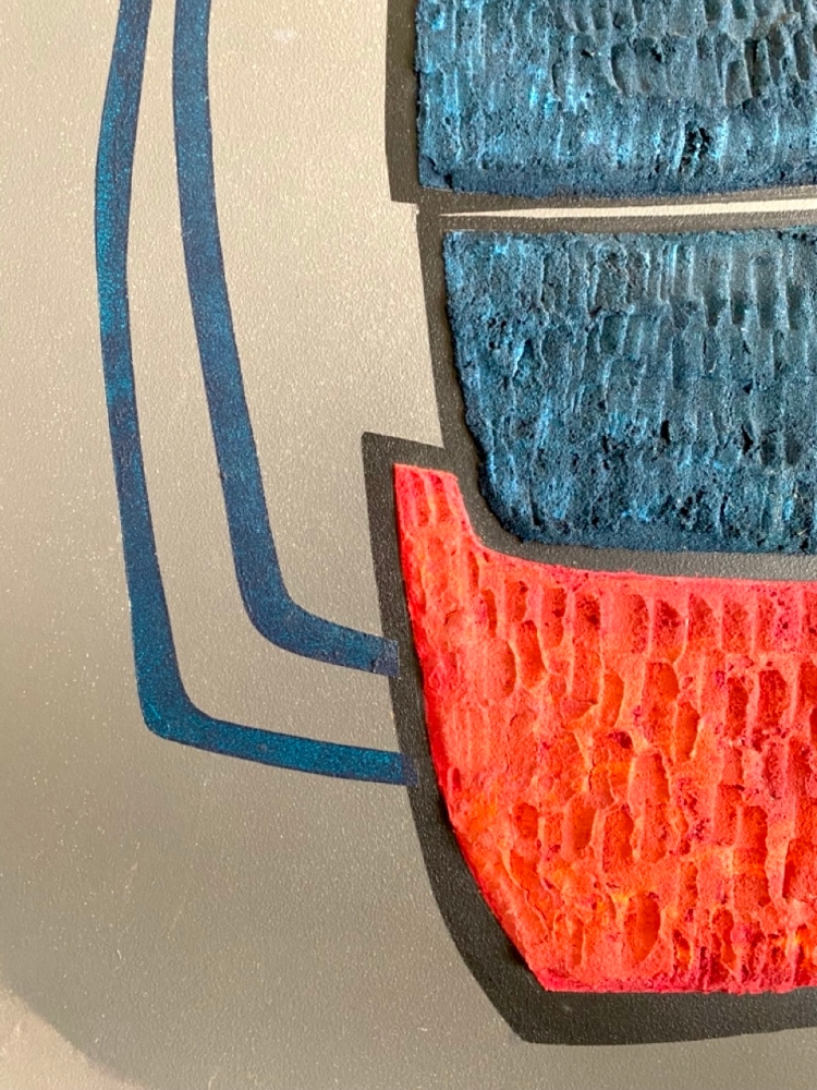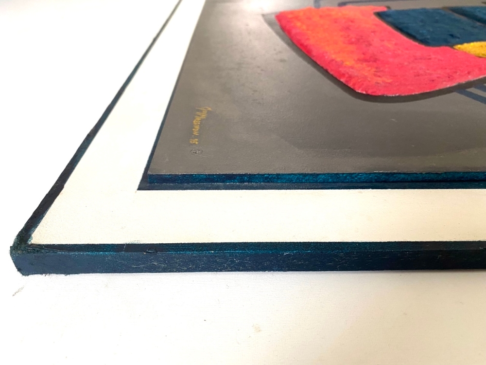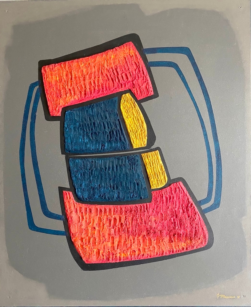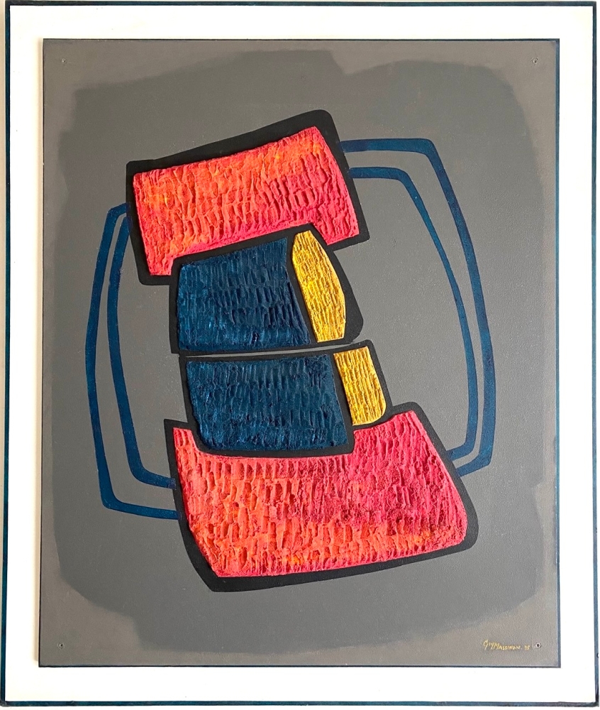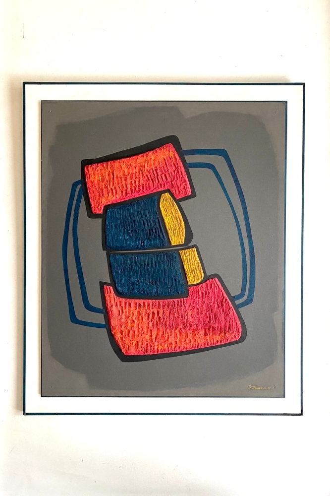 Abstract relief, 1995 Mixed media on panel, signed and dated. Weight 12kg In original architectural frame Powerful abstract relief work by Guy Masimon from the mid-1980s. The work is composed of carefully built, paste-like colour planes in red, deep blue and ochre, outlined with black contours and set against a grey background. The pronounced texture and relief give the piece a strong tactile and sculptural presence. In this work, Masimon explores the tension between form, colour and space. The geometric composition appears balanced yet dynamic, with a clear architectural structure characteristic of his mature period. The raised presentation within the frame further enhances the material and object-like quality of the work.