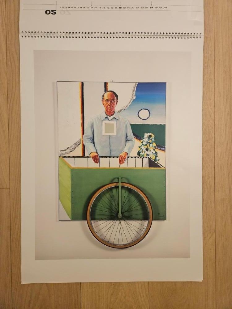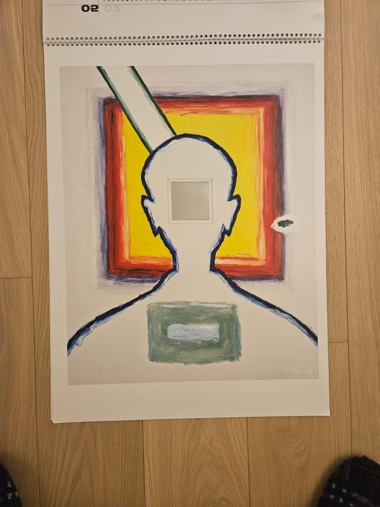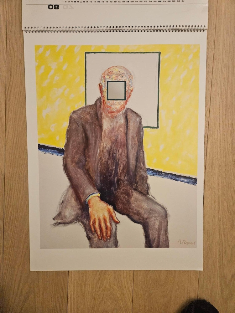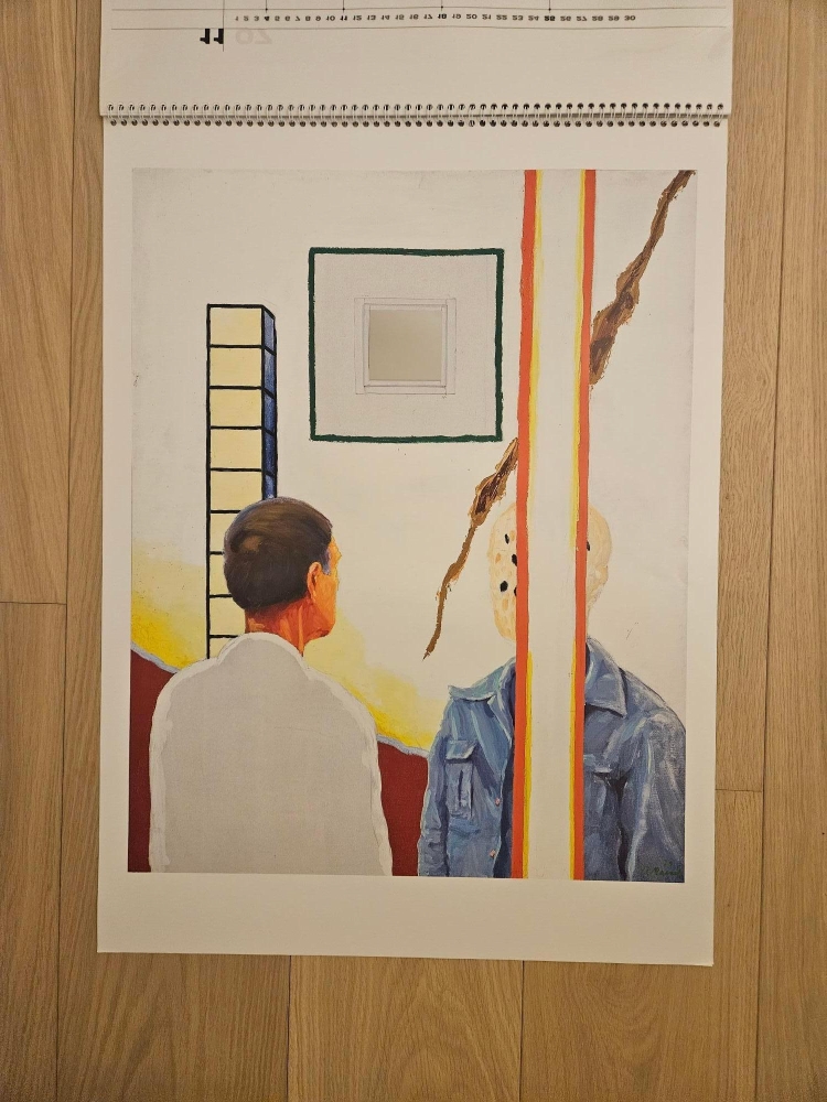 Eeuwigdurende kalender: twaalf afbeeldingen van werk van Roger RAVEEL in groot formaat. Zowat de helft van de pagina's zijn een mixed media werk, nl. opgehoogd met een spiegel (typisch voor het werk van Raveel). Zie foto's. Met gedichten van Roland JOORIS op de achterzijde van elke maand. In uitzonderlijk perfecte staat Uitgegeven door drukkerij Antilope ter gelegenheid van de 75ste verjaardag van Roger Raveel