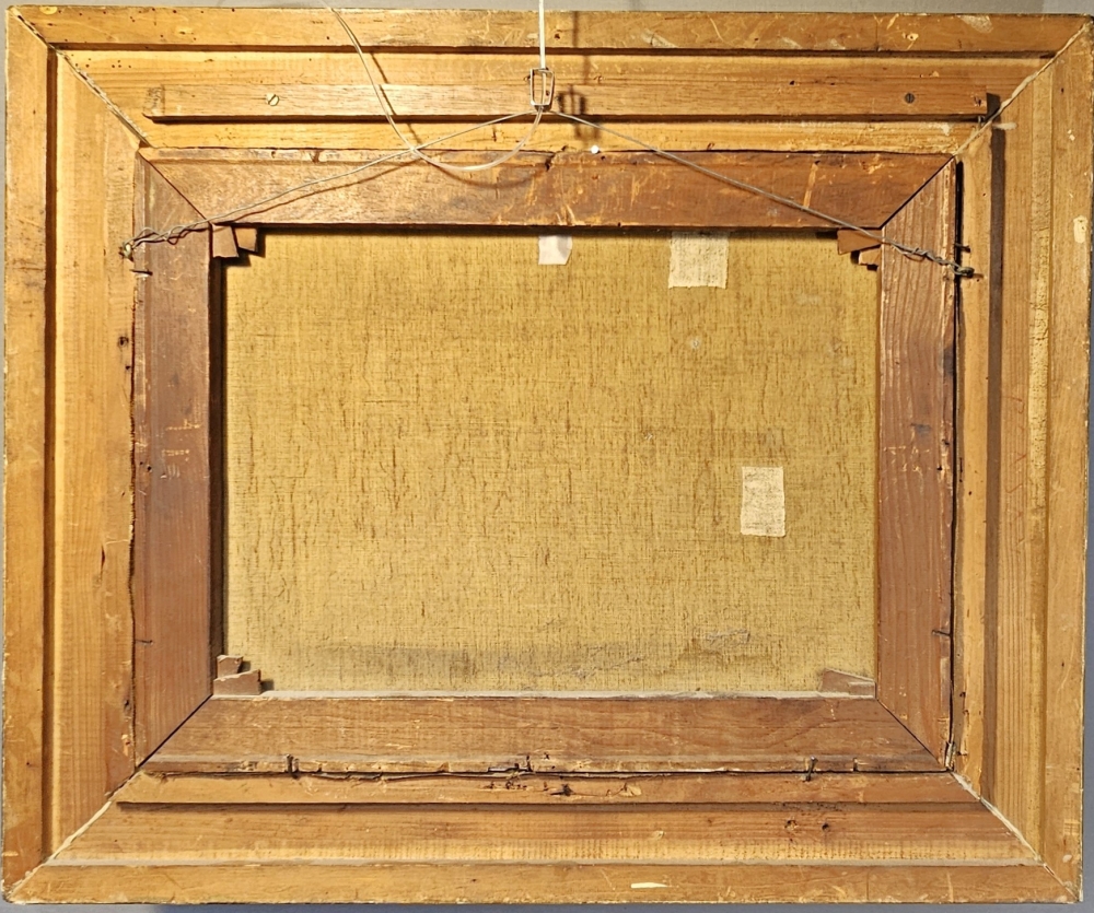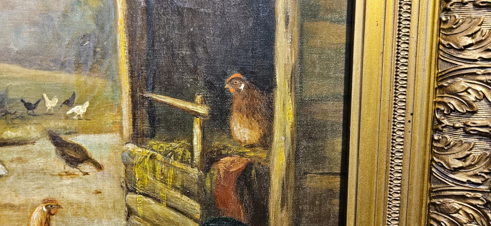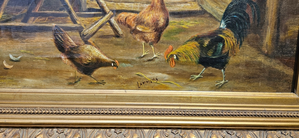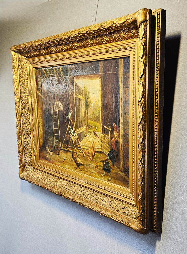 Sfeervol 19e-eeuws Stalinterieur met Pluimvee Wilhelm Albertus Lammers (1857–1913) Olieverf op doek circa 1890 - 1910 Een prachtig, karakteristiek Nederlands stalinterieur dat de kijker meeneemt naar het boerenleven van de late 19e eeuw. Centraal in de compositie staat een levendige groep kippen en een trotse haan, meesterlijk weergegeven in warme aardetinten. Bijzonder aan dit werk is het geraffineerde lichtgebruik: door de open staldeur in de achtergrond valt een helder, natuurlijk licht naar binnen dat een fraai contrast vormt met de sfeervolle schaduwen van de stal. De compositie ademt rust en ambacht uit, typerend voor de Hollandse school uit deze periode. Afmetingen: ca, 38.5 x 50.5 cm doek en 56 x 68 cm inclusief lijst Conditie: In goede staat met kleine gaatje en restauratie werkjes, antieke staat met een passend patina dat bijdraagt aan de historische uitstraling. Inclusief de originele, rijk gedecoreerde vergulde houten kaderlijst