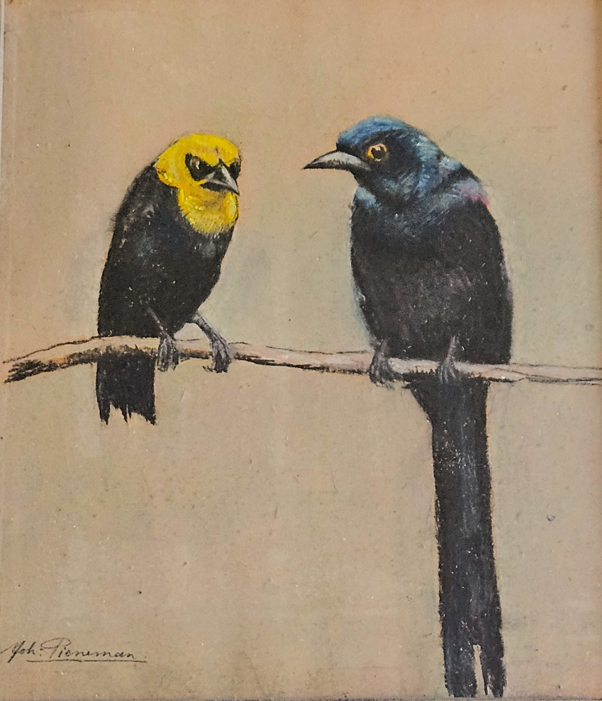 Johanna Hendrika Pieneman (1889-1986) Twee vogels op een tak, De vogels die in het kunstwerk zijn afgebeeld zijn waarschijnlijk Geelkapmerels (Chrysomus icterocephalus). Het mannetje van deze soort is volledig zwart behalve het gele hoofd en de borst, terwijl het vrouwtje een combinatie is van geel op de keel en een zwart lichaam. Johanna Pieneman stond bekend om haar pasteltekeningen van vogels, die ze bestudeerde in de volières van de Artis-dierentuin in Amsterdam Pasteltekening op papieren Afmetingen: H. 27 x B. 23 cm met lijst, H. 44 x B. 39 cm Goede staat - gebruikt met kleine tekenen van ouderdom en vlekjes- zie foto's Johanna Hendrika Pieneman, geboren 17 februari 1889 te Amsterdam en overleden 28 april 1986 eveneens te Amsterdam CT160221ZH1377