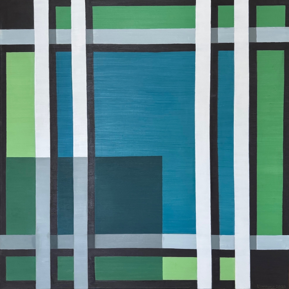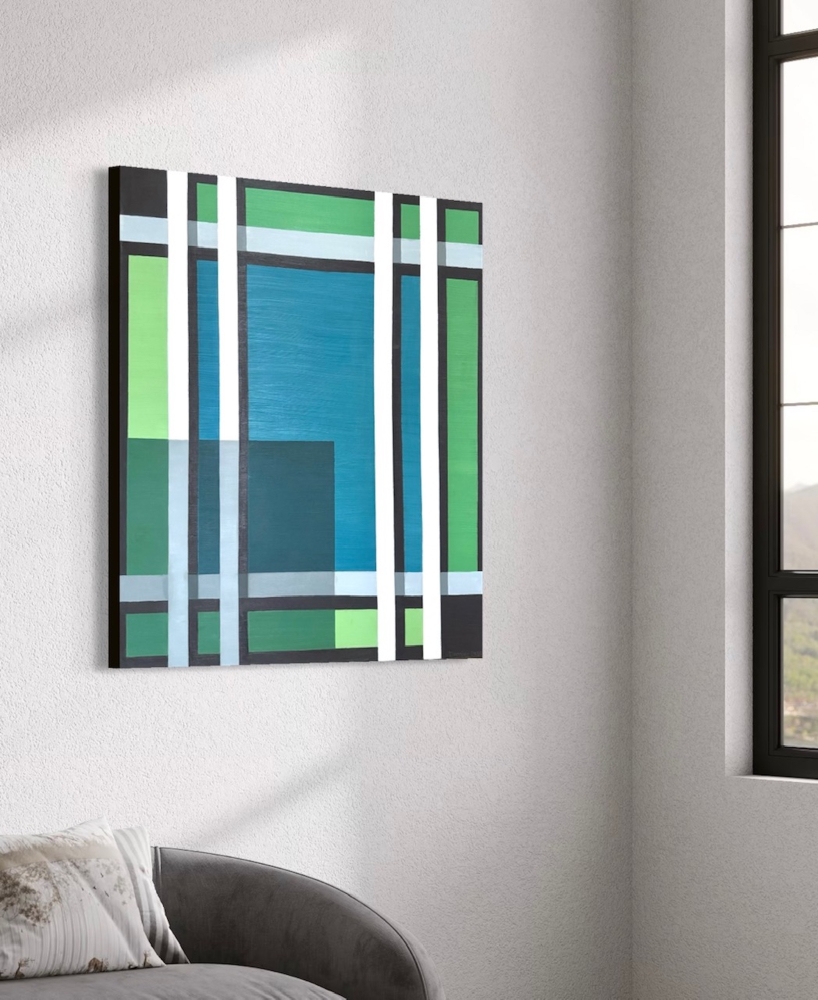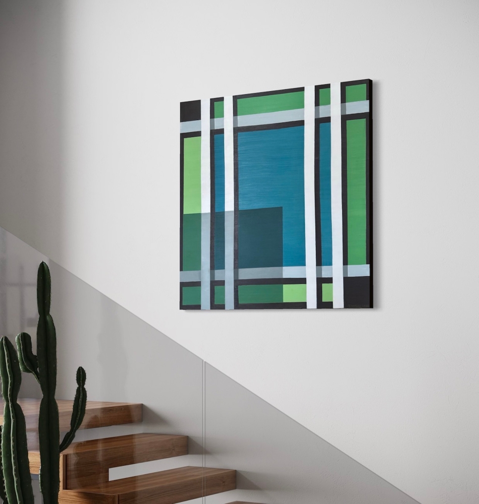 This painting is a clean, geometric abstract made up of layered rectangles and bands that interlock like a modern grid. The composition is dominated by vertical and horizontal stripes in deep blue, muted greens, off-white, gray, and dark brown/black. Thick vertical white bands run through the piece, breaking up blocks of color and creating a sense of rhythm and structure. A large blue rectangle sits near the center, anchoring the composition, while narrower green and teal panels appear along the sides and bottom. The colors feel cool and restrained, with subtle contrasts rather than sharp clashes. Many shapes appear semi-transparent or layered, so you can see edges overlapping, which gives the painting depth despite its flat, minimalist style. Overall, it feels architectural and balanced, almost like a stylized window, city facade, or abstract map—calm, orderly, and modern, with a quiet sense of movement created by the repeating line Arcane