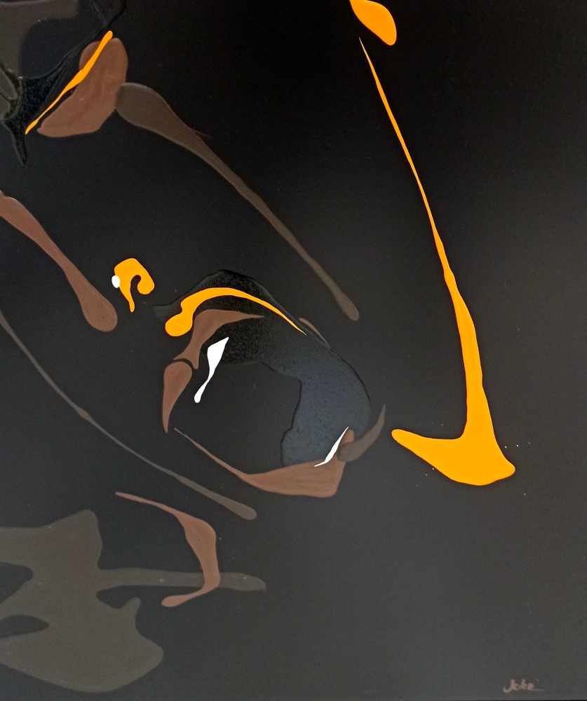 Colorful composition - professionally framed in a frame - gallery price: 2,000 - Joke Debeuckelaere graduated from Ghent University of Applied Sciences (KASK) Visual Arts - Graphic Design. The acrylic-based portraits are characterized by their pronounced colors and exceptional technology. Joke shapes her paintings. The designs for these paintings are created in a computer graphics program. And then transferred to an MDF panel, where the paint is poured in layers, creating a relief. A brush is only used in the final finishing phase.