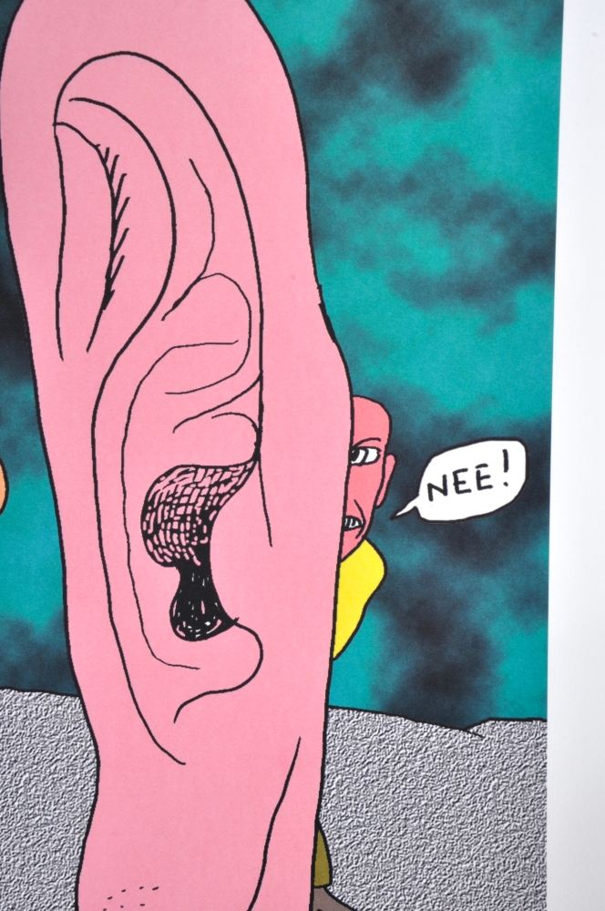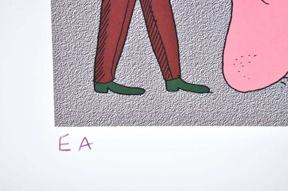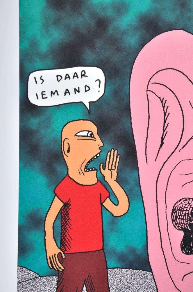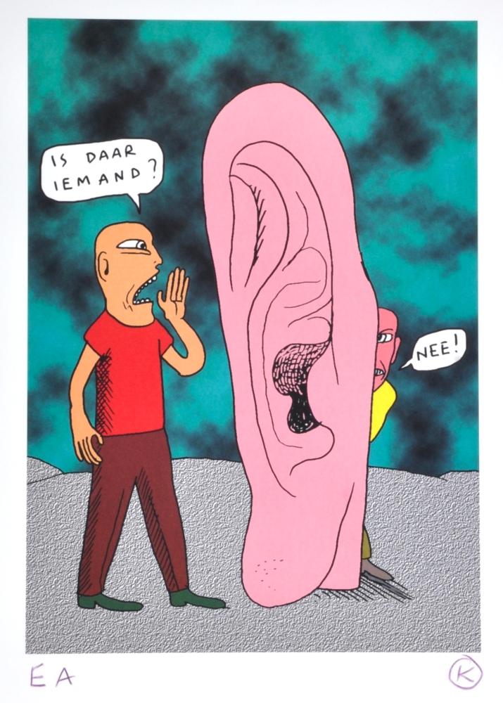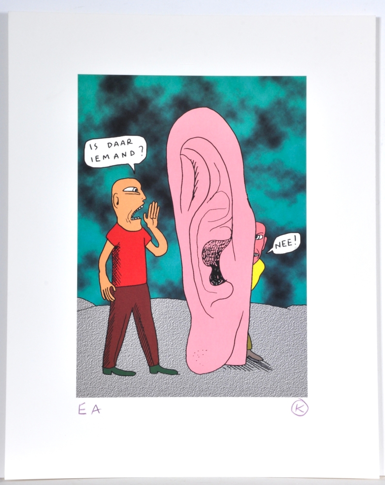 Beautiful screen print of Kamagurka - Kamagurka (b. 1956) is a Belgian artist, cartoonist and performer, known for his absurdist and often humorous work. He became known with comic series and cartoons in Humo, among others, and also worked as a painter, theater maker and musician. His visual work combines naive drawing style with satire, absurdism and commentary on society.