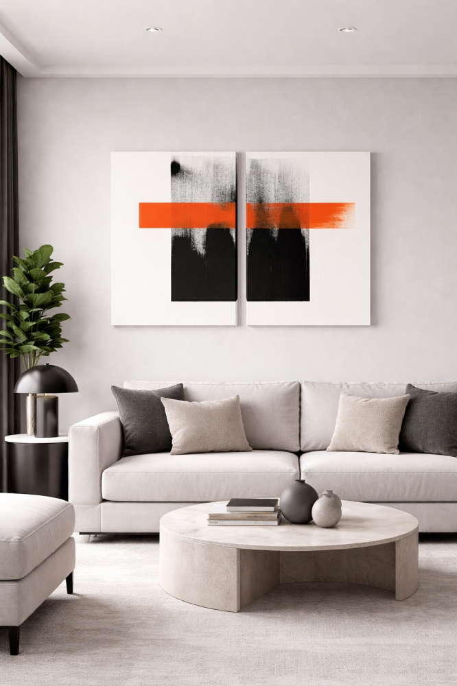 2 luik > 30x40cm/canvas Canvas cotton Acrylic paint. Het geheel straalt een moderne, abstracte esthetiek uit waarin eenvoud en expressie samenkomen. De combinatie van strakke lijn en ruwe verfstructuur zorgt voor een intrigerend spel tussen controle en vrijheid, terwijl het tweeluik als geheel een gevoel van continuïteit en verbondenheid oproept.