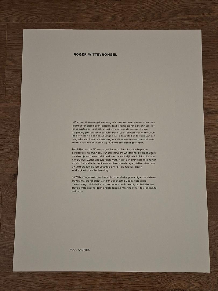 typical hyperrealistic lithography by Roger Wittevrongel with accompanying text. From the collection folder '50 artists' from 1977 with graphics by various artists. Dimensions: 55 x 42 cm. Signed and numbered 71/250. Work is in very good condition and not framed