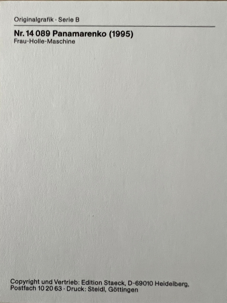 Uitgegeven in kleine oplage door Staeck. In krasvrij plexibox. Panamarenko's werk met de titel Bernoulli verwijst naar fysica-concepten die hij als kunstenaar en uitvinder onderzocht, vaak in relatie tot ruimte, beweging en vlucht Poskaartformaat zie fotos voor en achterkant.