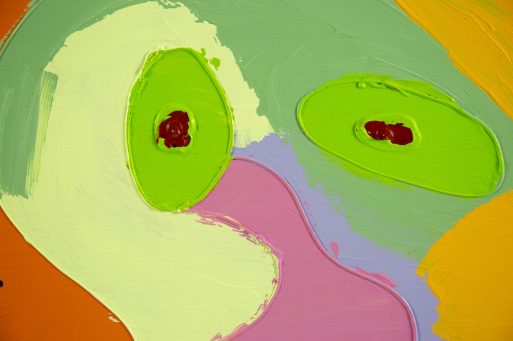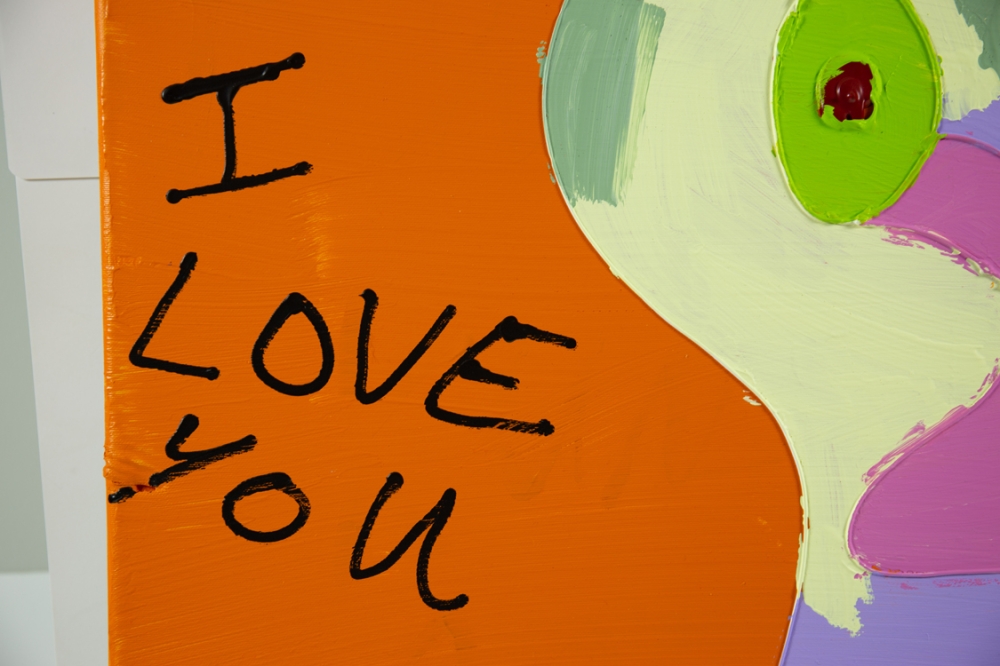 Origineel schilderij met acrylverf van Hannes D'Haese met zijn karakteristieke hoofd en vogeltjes, vergezelgd van het opschrift "I love you".