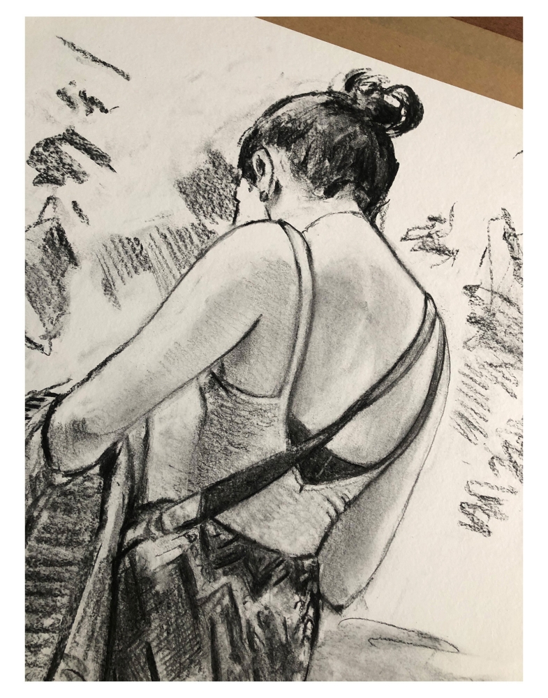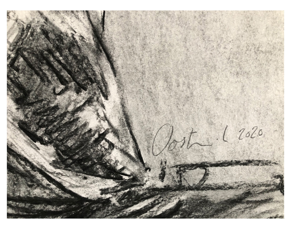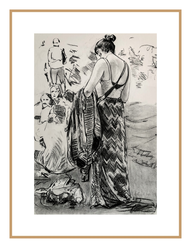 This work is number 2 in a series inspired by a visit to the Mauerpark in Berlin. It is the place in Berlin where people come together on Sundays to meet and make music. Lots to see and listen to. This work is a charcoal drawing on paper in a wooden frame measuring 120 x 90 cm.