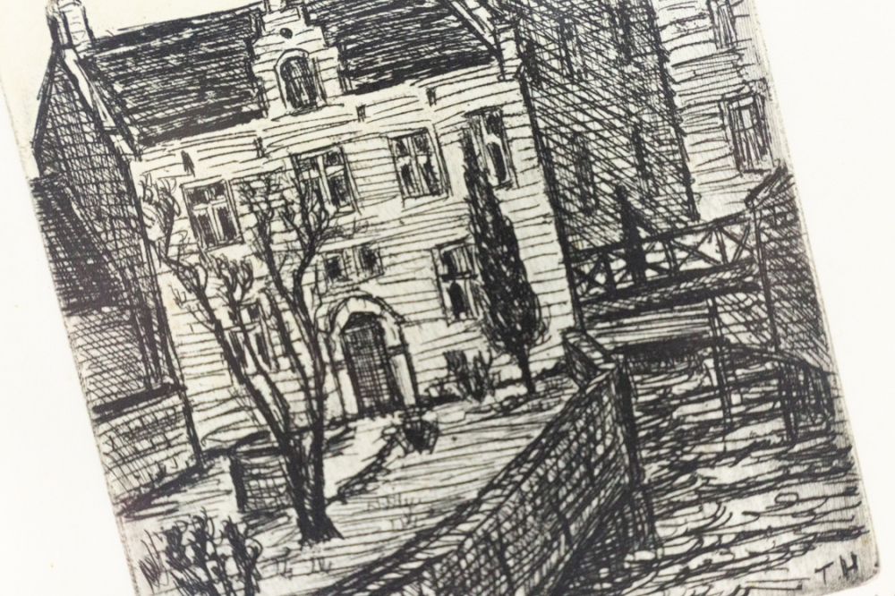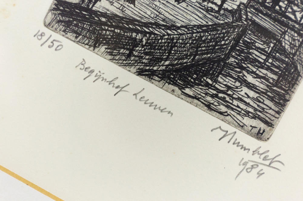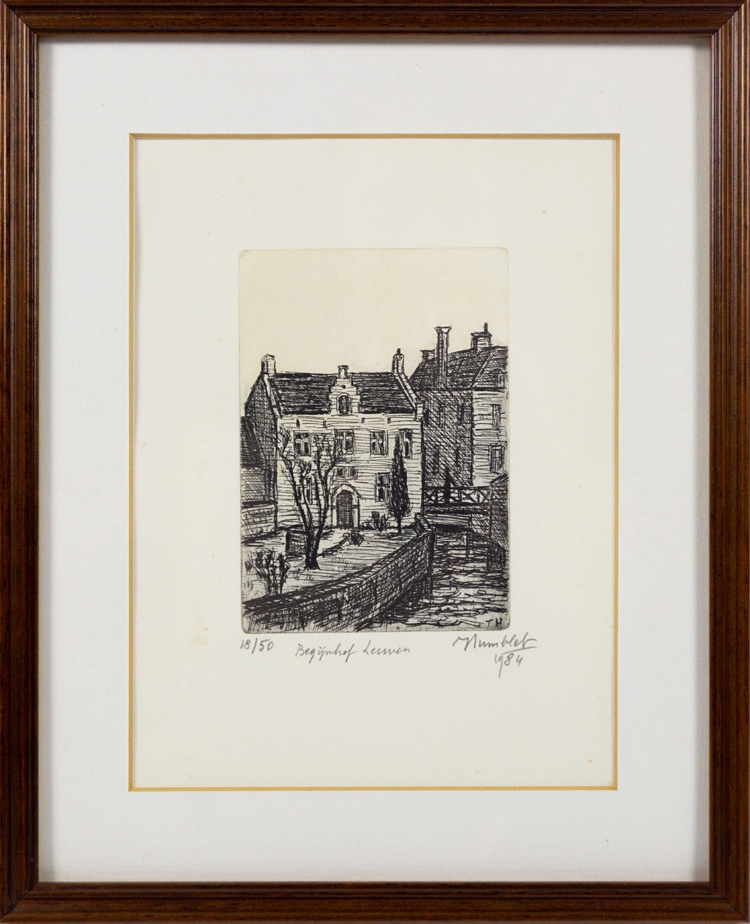 Ets van Theo Humblet, Belgische kunstenaar geboren in 1919 te Leuven. Hij was directeur in de Academie voor schone kunsten van Leuven van 1959 tot 1979. Op de ets is zoals de titel stelt het begijnhof Leuven afgebeeld.