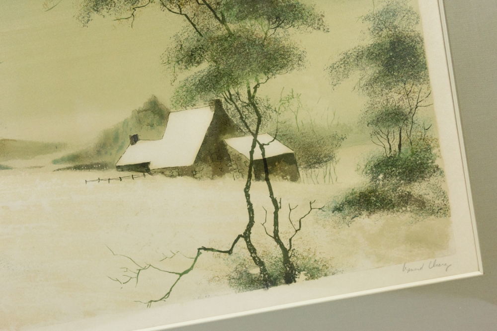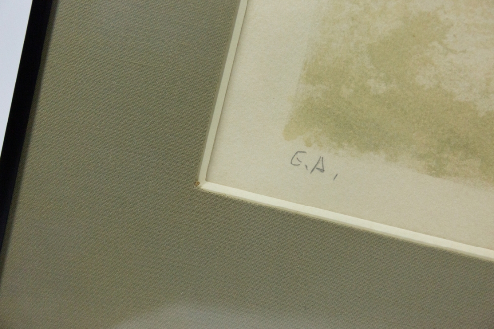 The work is framed in a black aluminum frame and a cloth passe-partout. The frame is in good condition.