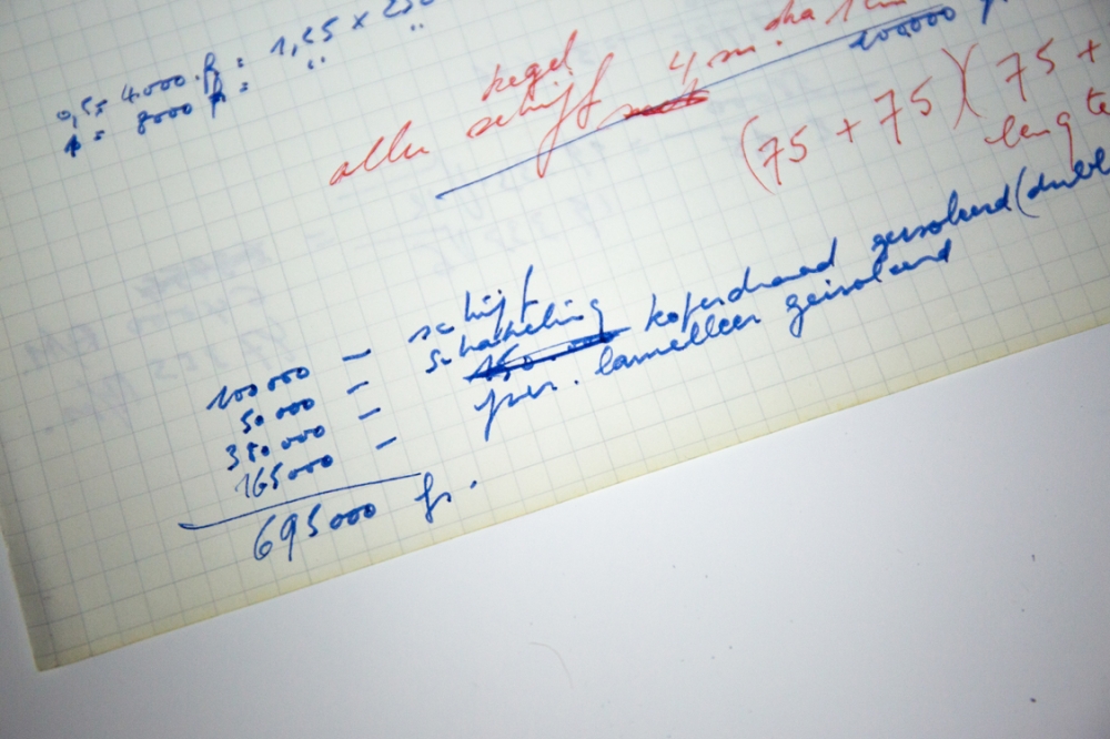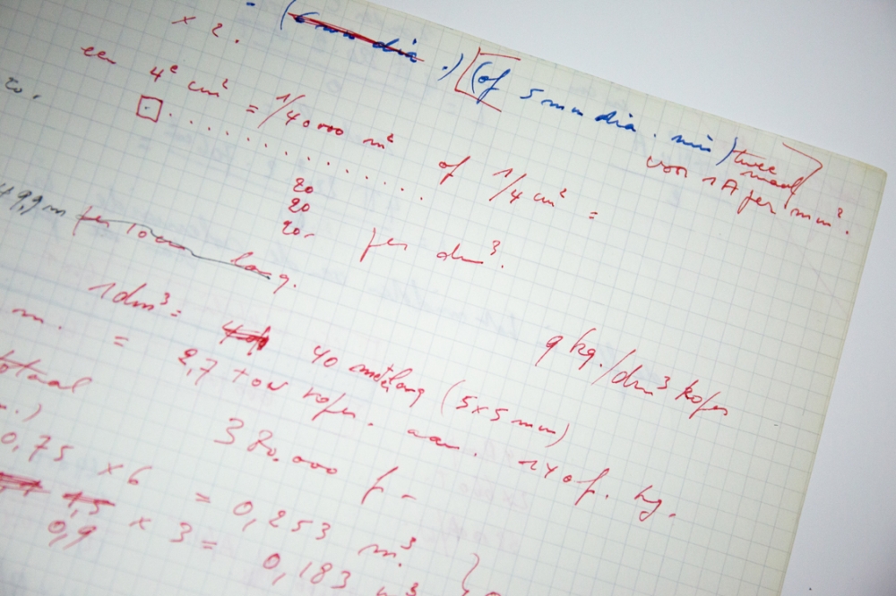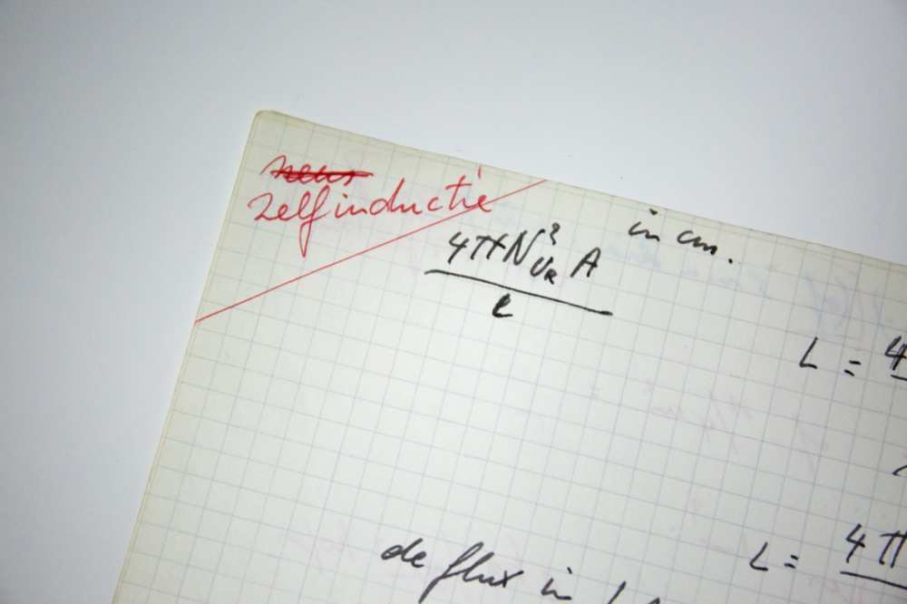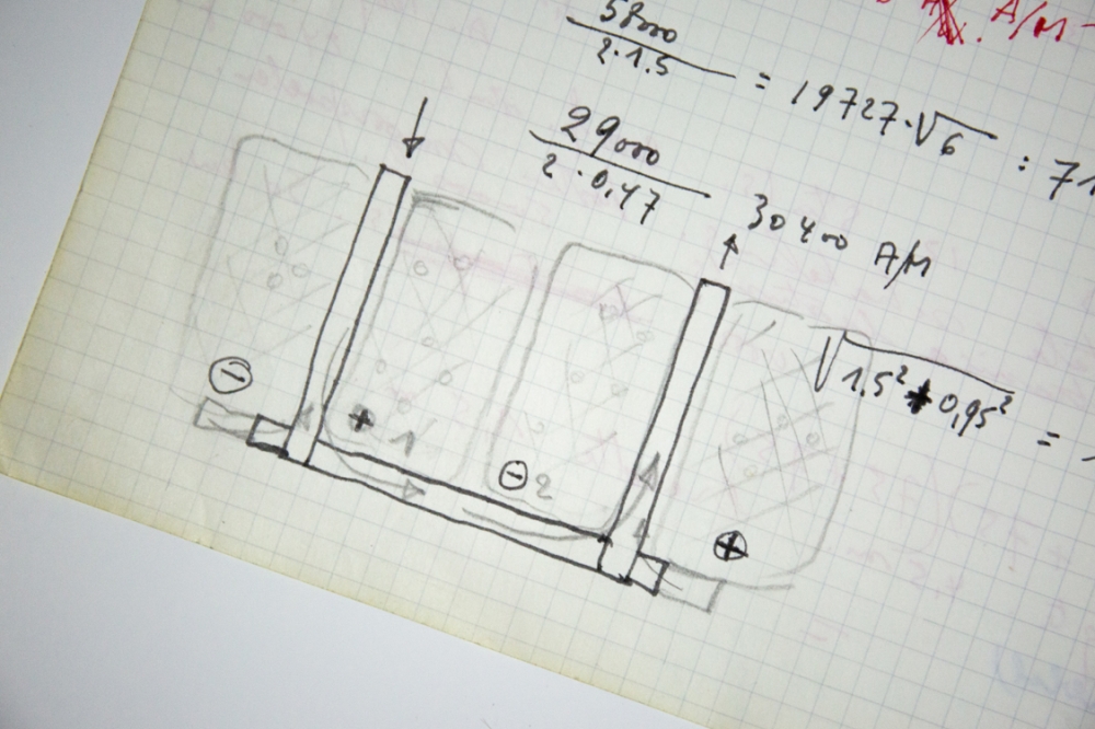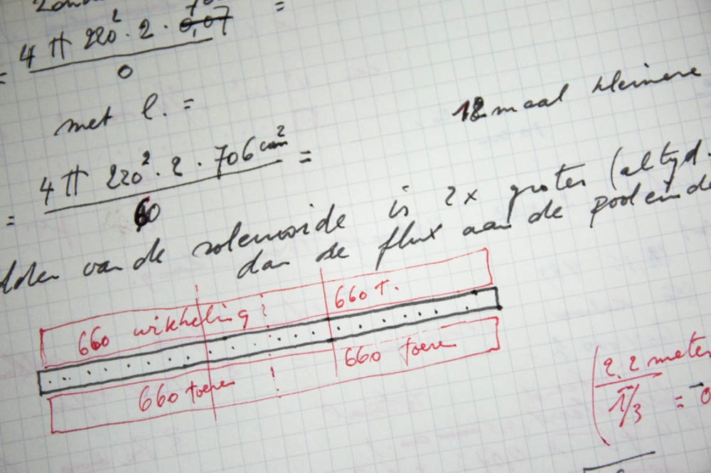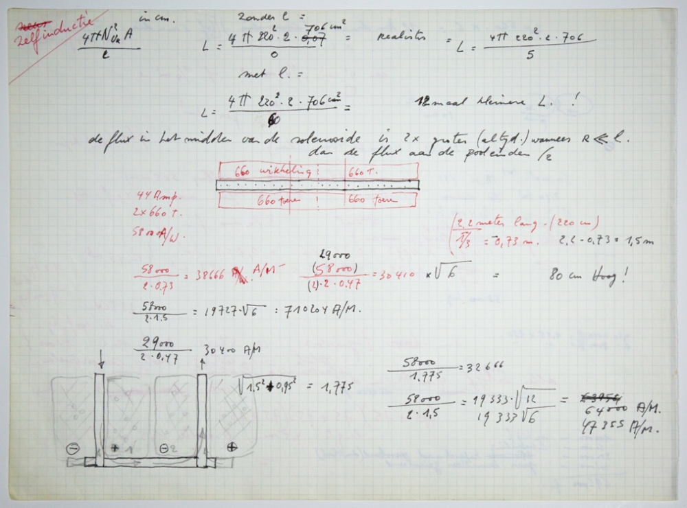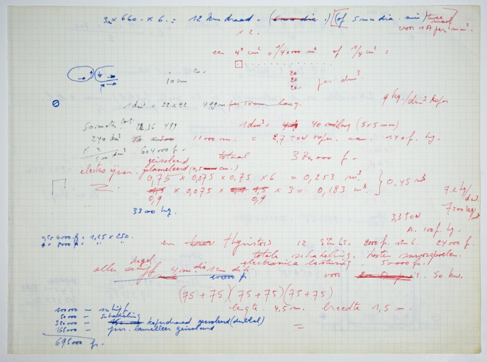Original, uniquely described page from Panamarenko's personal sketchbook "Balance the opposing poles and lift the machine" from 1982. On this page, on both pages (see photo 1 and 2), are his calculations and findings on the development of his magnetic or electrical works from that period. These pages are silent proof that Panamarenko's works were more than just creative figments and were technically and scientifically underpinned.