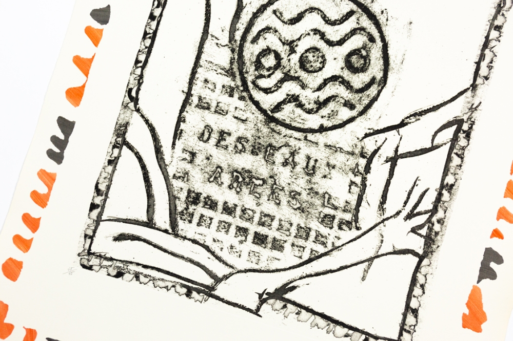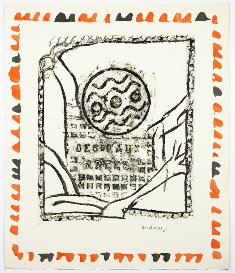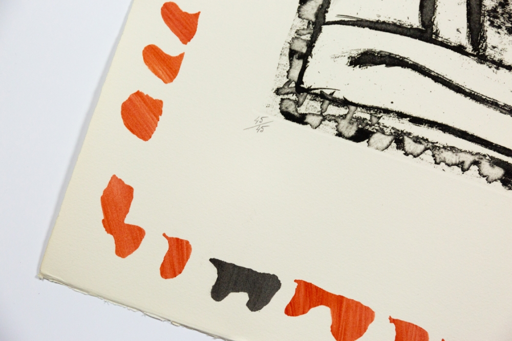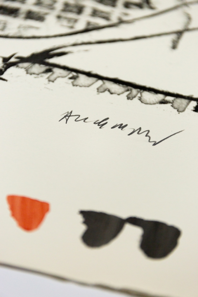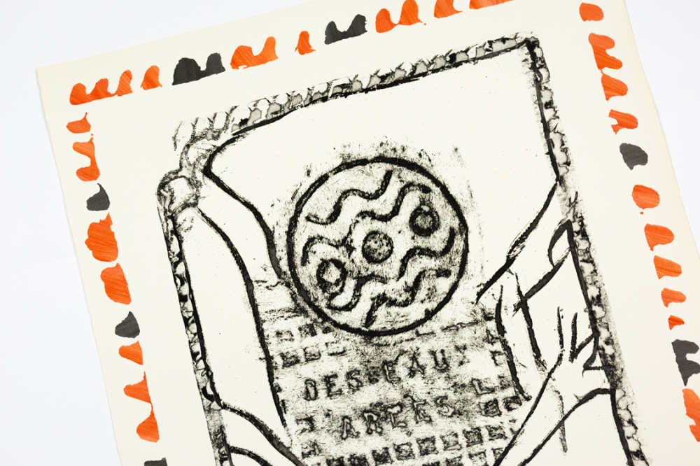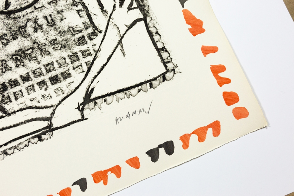 Lithograph by Pierre Alechinsky from 1987. This belongs to the suite of 6 lithographs Piece du mobilier urbain, Arles.
