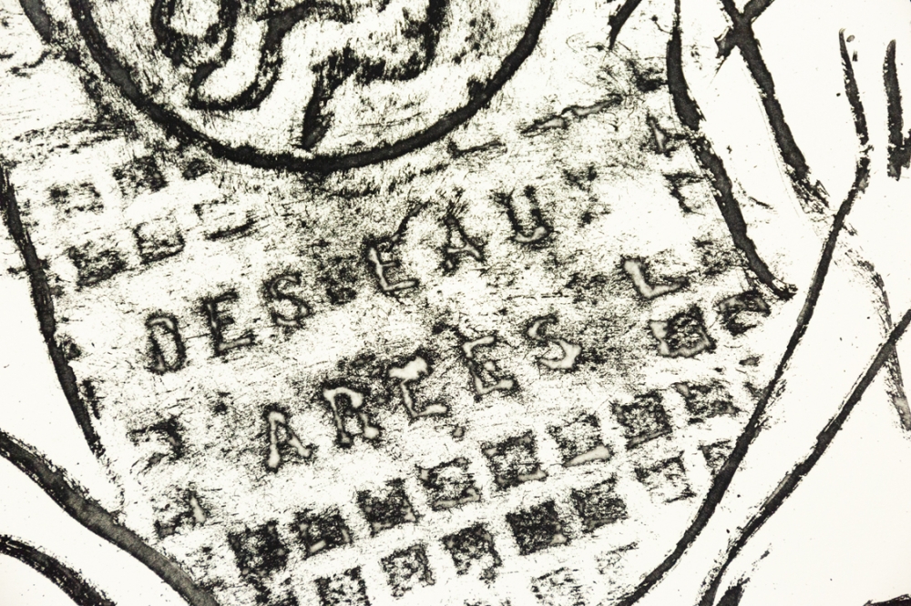 What is interesting about this work is that he used the manhole covers in the city of Arlon to arrive at this image. Also nice is the use of the pochoir or template on the outside.