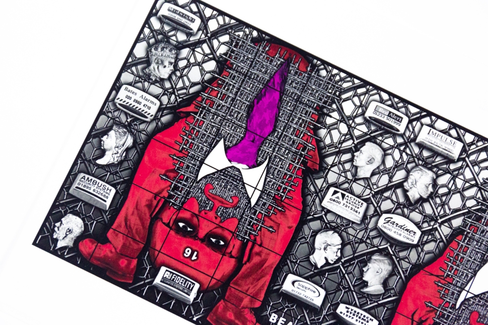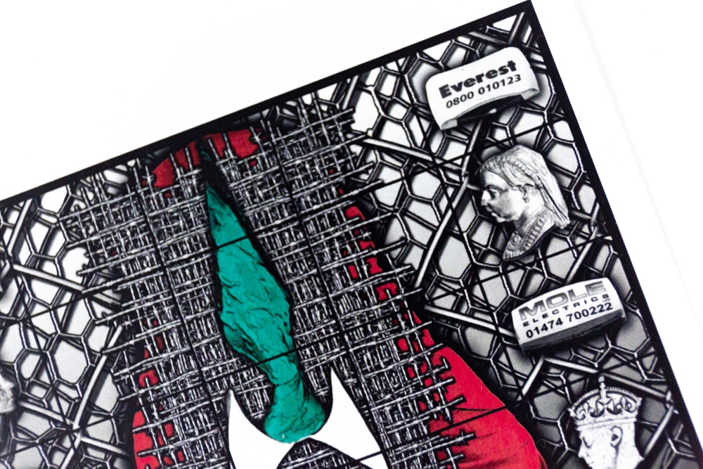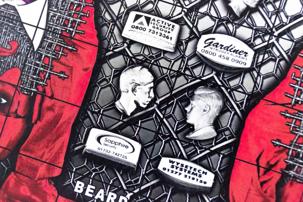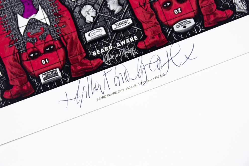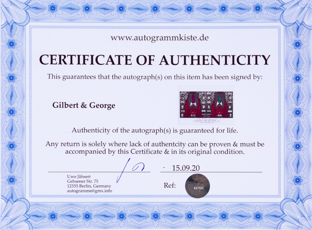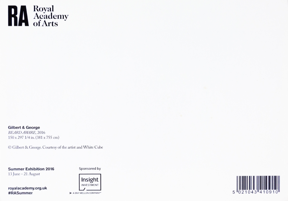 A card with image of the work "Bear Aware" by Gilbert & George from the exhibition in 2016 at the Royal Academy of Arts in London. The card is signed by hand.